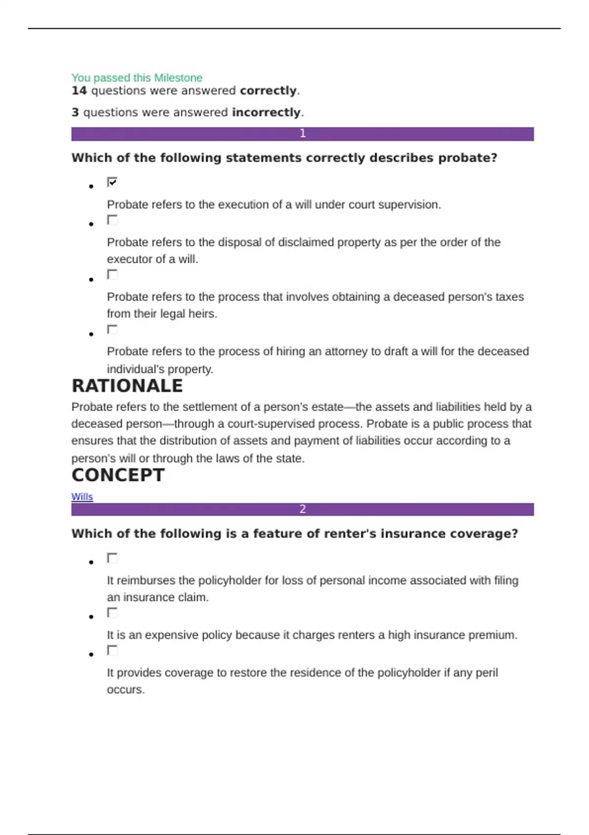 Which of the following statements correctly describes probate? Probate refers to the execution of a will under court supervision. Probate refers to the disposal of disclaimed property as per the order of the executor of a will. Probate refers to the process that involves obtaining a deceased person's taxes from their legal heirs. Probate refers to the process of hiring an attorney to draft a will for the deceased individual's property. RATIONALE Probate refers to the settlement of a person’s estate—the assets and liabilities held by a deceased person—through a court-supervised process. Probate is a public process that ensures that the distribution of assets and payment of liabilities occur according to a person’s will or through the laws of the state. CONCEPT Wills 2 Which of the following is a feature of renter's insurance coverage? It reimburses the policyholder for loss of personal income associated with filing an insurance claim. It is an expensive policy because it charges renters a high insurance premium. It provides coverage to restore the residence of the policyholder if any peril occurs.