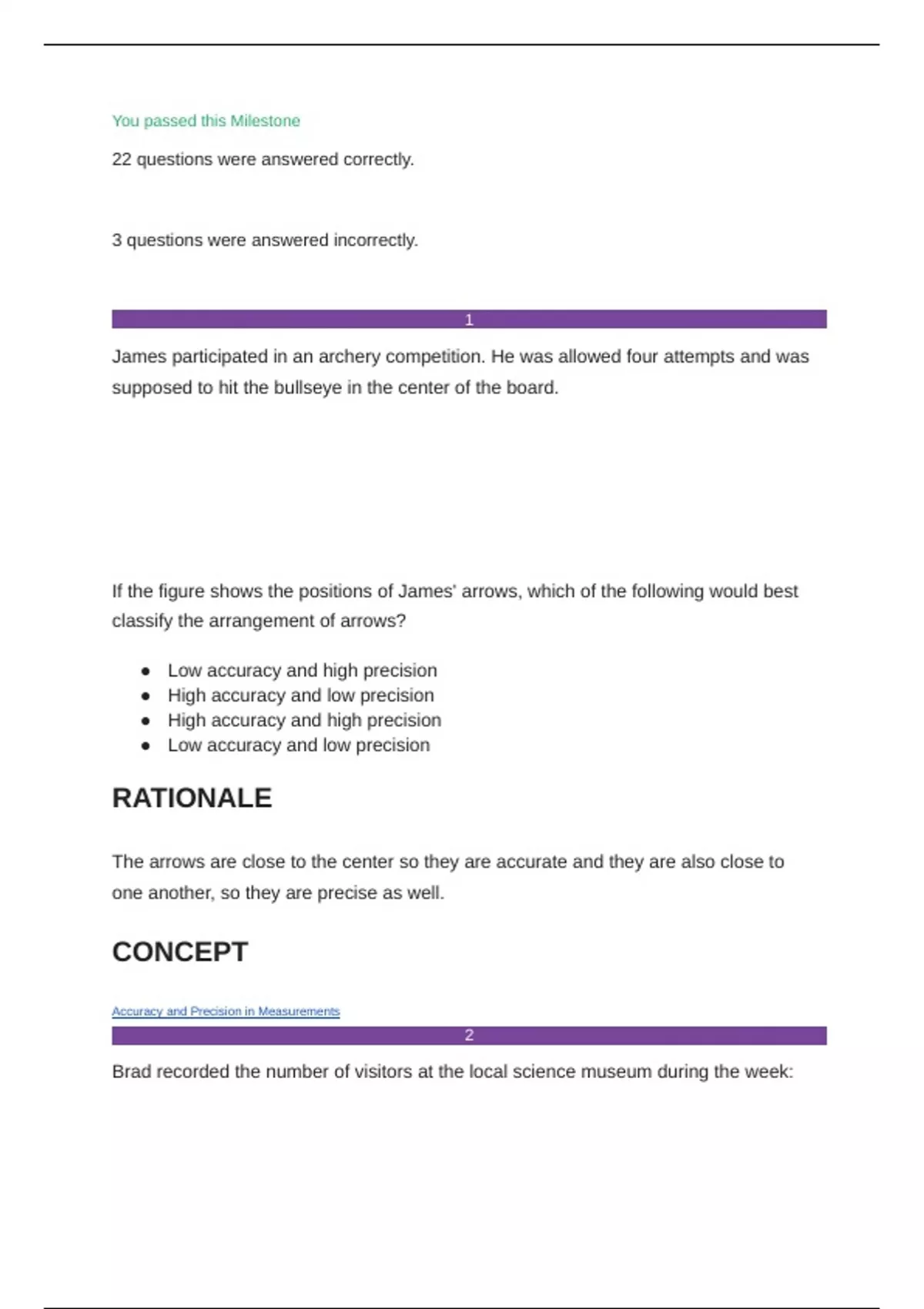 James participated in an archery competition. He was allowed four attempts and was supposed to hit the bullseye in the center of the board. If the figure shows the positions of James' arrows, which of the following would best classify the arrangement of arrows? ● Low accuracy and high precision ● High accuracy and low precision ● High accuracy and high precision ● Low accuracy and low precision RATIONALE The arrows are close to the center so they are accurate and they are also close to one another, so they are precise as well. CONCEPT Accuracy and Precision in Measurements 2 Brad recorded the number of visitors at the local science museum during the week: Day Visitors Tuesday 18 Wednesday 24 Thursday 28 Friday 30 He expected to see 25 visitors each day. To answer whether the number of visitors follows a uniform distribution, a chi-square test for goodness of fit should be performed. (alpha = 0.10) What is the chi-squared test statistic? Answers are rounded to the nearest hundredth. ● 3.36 ● 1.12 ● 2.54