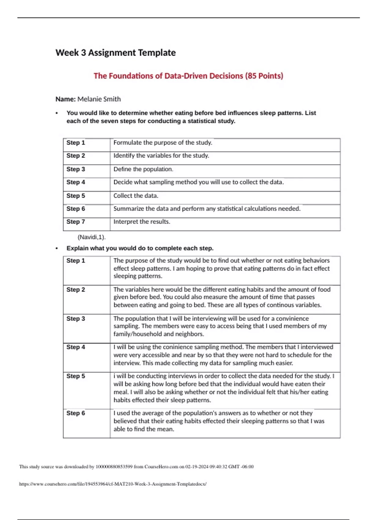 Week 3 Assignment Template The Foundations of Data-Driven Decisions (85 Points) Name: Melanie Smith • You would like to determine whether eating before bed influences sleep patterns. List each of the seven steps for conducting a statistical study. Step 1 Formulate the purpose of the study. Step 2 Identify the variables for the study. Step 3 Define the population. Step 4 Decide what sampling method you will use to collect the data. Step 5 Collect the data. Step 6 Summarize the data and perform any statistical calculations needed. Step 7 Interpret the results.