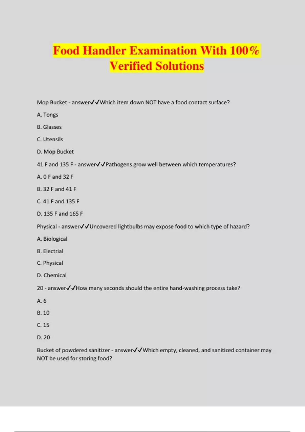Food Handler Examination With 100% Verified Solutions Mop Bucket - answerWhich item down NOT have a food contact surface? A. Tongs B. Glasses C. Utensils D. Mop Bucket 41 F and 135 F - answerPathogens grow well between which temperatures? A. 0 F and 32 F B. 32 F and 41 F C. 41 F and 135 F D. 135 F and 165 F Physical - answerUncovered lightbulbs may expose food to which type of hazard? A. Biological B. Electrial C. Physical D. Chemical 20 - answerHow many seconds should the entire ha