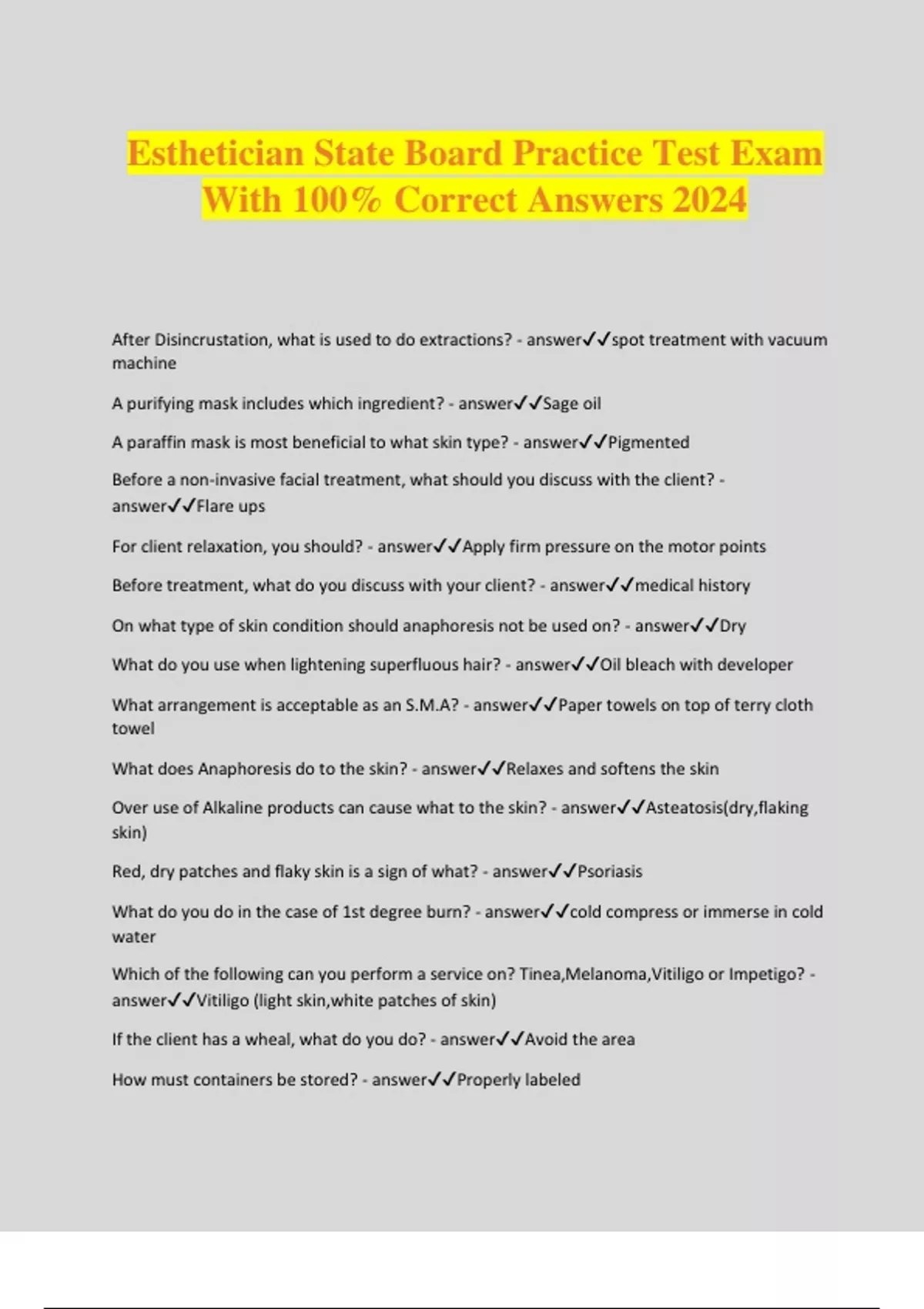 Esthetician State Board Practice Test Exam With 100% Correct Answers 2024 After Disincrustation, what is used to do extractions? - answerspot treatment with vacuum machine A purifying mask includes which ingredient? - answerSage oil A paraffin mask is most beneficial to what skin type? - answerPigmented Before a non-invasive facial treatment, what should you discuss with the client? - answerFlare ups For client relaxation, you should? - answerApply firm pressure on the motor points Before treatment, what do you discuss with your client? - answermedical history On what type of skin condition should anaphoresis not be used on? - answerDry What do you use when lightening superfluous hair? - answerOil bleach with developer What arrangement is acceptable as an S.M.A? - answerPaper towels on top of terry cloth towel What does Anaphoresis do to the skin? - answerRelaxes and softens the skin Over use of Alkaline products can cause what to the skin? - answerAsteatosis(dry,flaking skin) Red, dry patches and flaky skin is a sign of what? - answerPsoriasis What do you do in the case of 1st degree burn? - answercold compress or immerse in cold water Which of the following can you perform a service on? Tinea,Melanoma,Vitiligo or Impetigo? - answerVitiligo (light skin,white patches of skin) If the client has a wheal, what do you do? - answerAvoid the area How must containers be stored? - answerProperly labeled