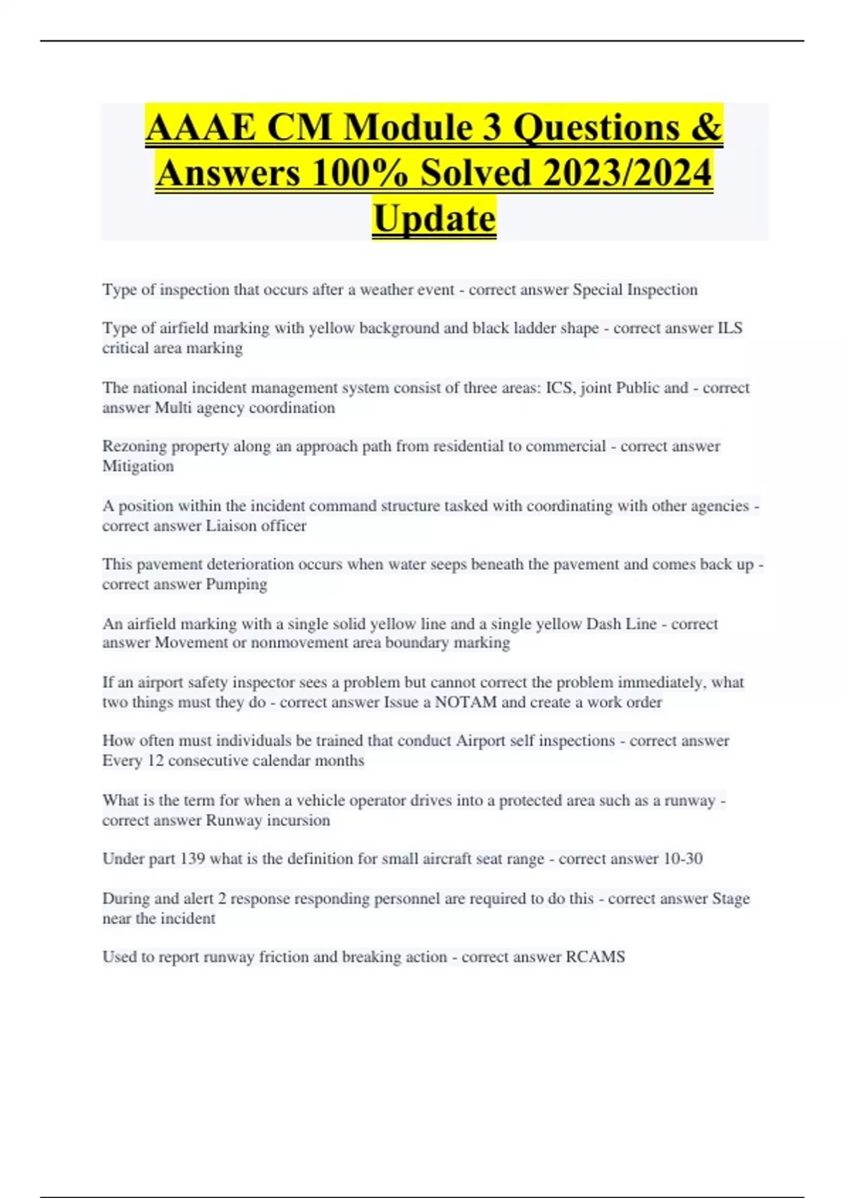 AAAE CM Module 3 Questions & Answers 100% Solved 2023/2024 Update Type of inspection that occurs after a weather event - correct answer Special Inspection Type of airfield marking with yellow background and black ladder shape - correct answer ILS critical area marking The national incident management system consist of three areas: ICS, joint Public and - correct answer Multi agency coordination Rezoning property along an approach path from residential to commercial - correct answer Mitigation A position within the incident command structure tasked with coordinating with other agencies - correct answer Liaison officer This pavement deterioration occurs when water seeps beneath the pavement and comes back up - correct answer Pumping An airfield marking with a single solid yellow line and a single yellow Dash Line - correct answer Movement or nonmovement area boundary marking If an airport safety inspector sees a problem but cannot correct the problem immediately, what two things must they do - correct answer Issue a NOTAM and create a work order How often must individuals be trained that conduct Airport self inspections - correct answer Every 12 consecutive calendar months What is the term for when a vehicle operator drives into a protected area such as a runway - correct answer Runway incursion