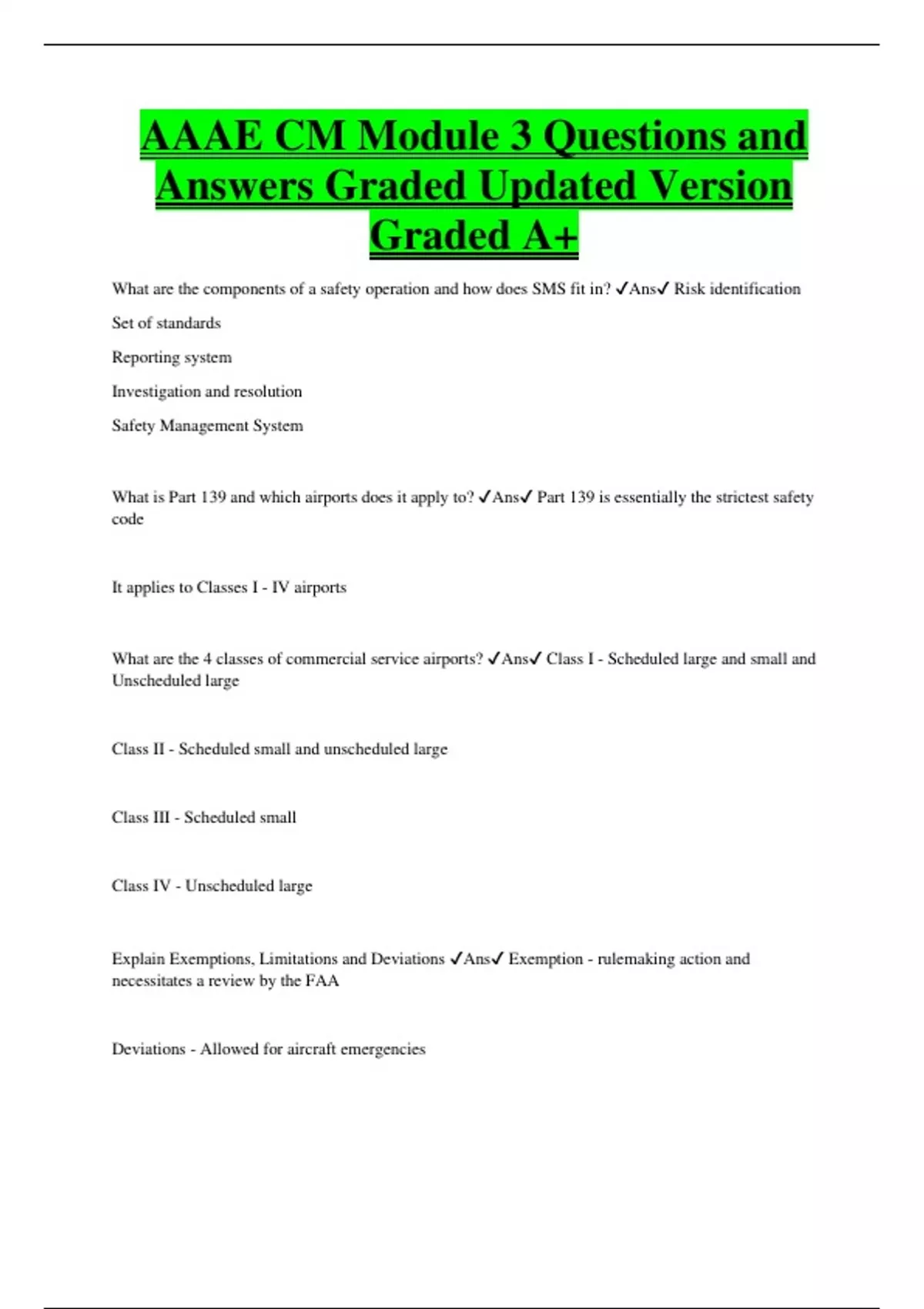 AAAE CM Module 3 Questions and Answers Graded Updated Version Graded A+ What are the components of a safety operation and how does SMS fit in? Ans Risk identification Set of standards Reporting system Investigation and resolution Safety Management System What is Part 139 and which airports does it apply to? Ans Part 139 is essentially the strictest safety code It applies to Classes I - IV airports What are the 4 classes of commercial service airports? Ans Class I - Scheduled large and small and Unscheduled large