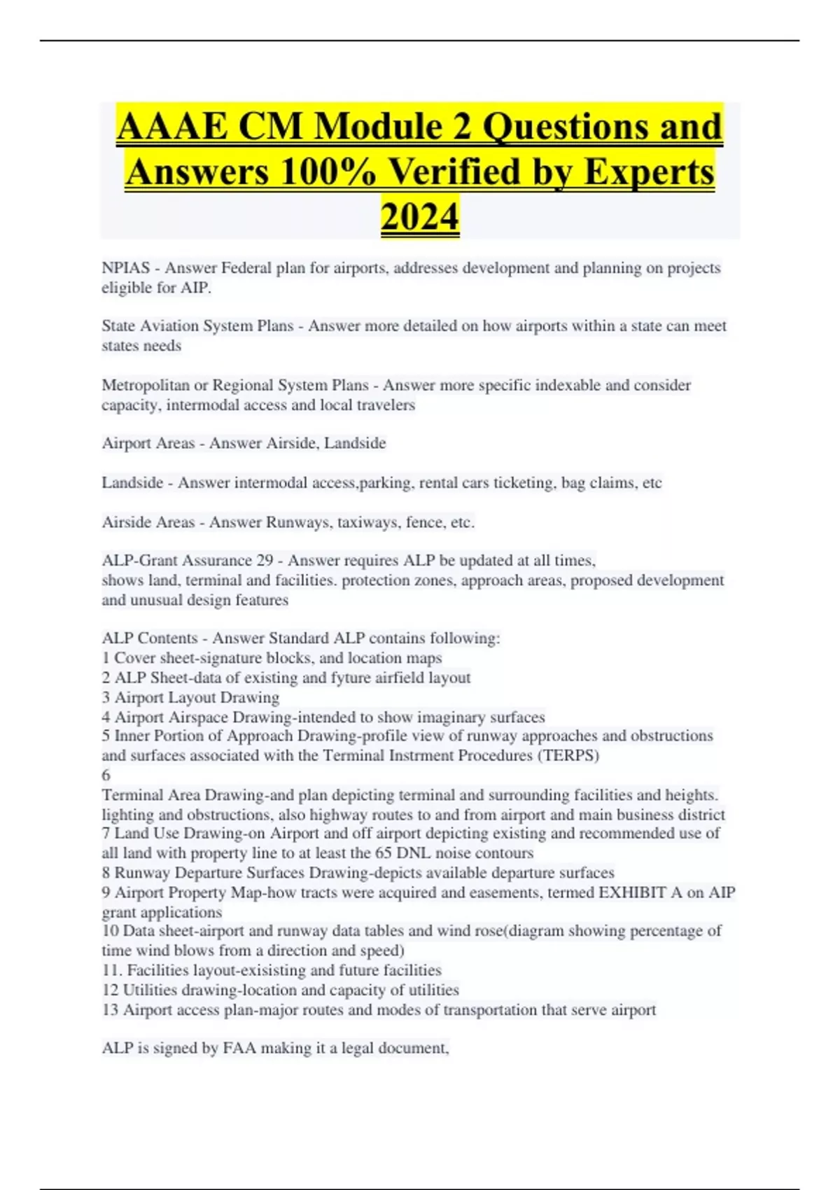AAAE CM Module 2 Questions and Answers 100% Verified by Experts 2024 NPIAS - Answer Federal plan for airports, addresses development and planning on projects eligible for AIP. State Aviation System Plans - Answer more detailed on how airports within a state can meet states needs Metropolitan or Regional System Plans - Answer more specific indexable and consider capacity, intermodal access and local travelers Airport Areas - Answer Airside, Landside Landside - Answer intermodal access,parking, rental cars ticketing, bag claims, etc Airside Areas - Answer Runways, taxiways, fence, etc. ALP-Grant Assurance 29 - Answer requires ALP be updated at all times, shows land, terminal and facilities. protection zones, approach areas, proposed development and unusual design features ALP Contents - Answer Standard ALP contains following: 1 Cover sheet-signature blocks, and location maps 2 ALP Sheet-data of existing and fyture airfield layout 3 Airport Layout Drawing 4 Airport Airspace Drawing-intended to show imaginary surfaces 5 Inner Portion of Approach Drawing-profile view of runway approaches and obstructions and surfaces associated with the Terminal Instrment Procedures (TERPS) 6 Terminal Area Drawing-and plan depicting terminal and surrounding facilities and heights. lighting and obstructions, also highway routes to and from airport and main business district 7 Land Use Drawing-on Airport and off airport depicting existing and recommended use of all land with property line to at least the 65 DNL noise contours 8 Runway Departure Surfaces Drawing-depicts available departure surfaces 9 Airport Property Map-how tracts were acquired and easements, termed EXHIBIT A on AIP grant applications 10 Data sheet-airport and runway data tables and wind rose(diagram showing percentage of time wind blows from a direction and speed) 11. Facilities layout-exisisting and future facilities 12 Utilities drawing-location and capacity of utilities 13 Airport access plan-major routes and modes of transportation that serve airport ALP is signed by FAA making it a legal document,