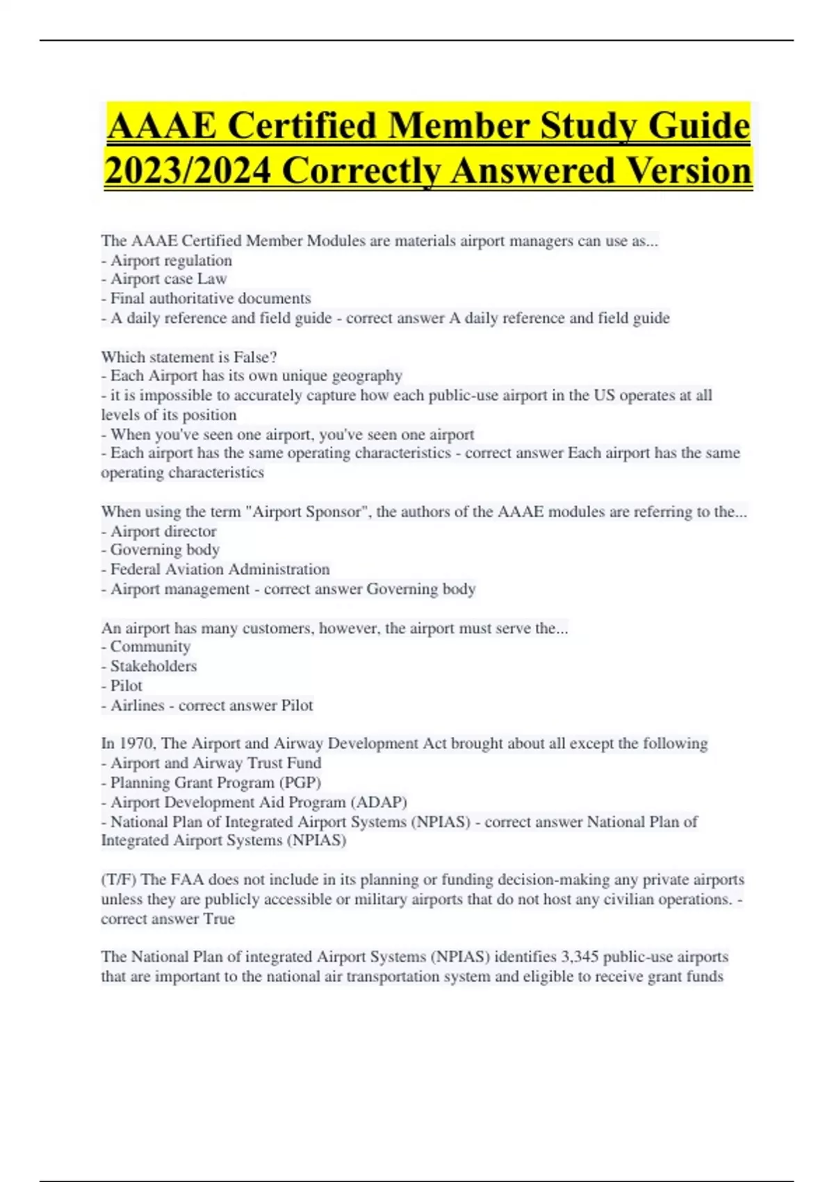 AAAE Certified Member Study Guide 2023/2024 Correctly Answered Version The AAAE Certified Member Modules are materials airport managers can use as... - Airport regulation - Airport case Law - Final authoritative documents - A daily reference and field guide - correct answer A daily reference and field guide Which statement is False? - Each Airport has its own unique geography - it is impossible to accurately capture how each public-use airport in the US operates at all levels of its position - When you've seen one airport, you've seen one airport - Each airport has the same operating characteristics - correct answer Each airport has the same operating characteristics When using the term "Airport Sponsor", the authors of the AAAE modules are referring to the... - Airport director - Governing body - Federal Aviation Administration - Airport management - correct answer Governing body An airport has many customers, however, the airport must serve the... - Community - Stakeholders - Pilot - Airlines - correct answer Pilot In 1970, The Airport and Airway Development Act brought about all except the following - Airport and Airway Trust Fund - Planning Grant Program (PGP) - Airport Development Aid Program (ADAP) - National Plan of Integrated Airport Systems (NPIAS) - correct answer National Plan of Integrated Airport Systems (NPIAS)