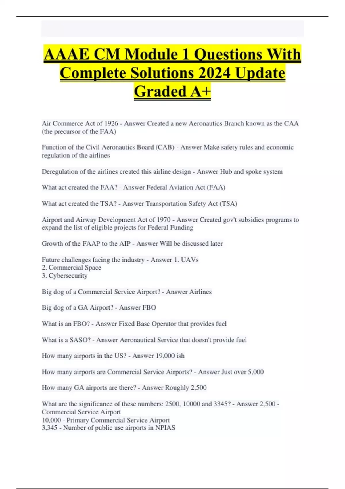 AAAE CM Module 1 Questions With Complete Solutions 2024 Update Graded A+ Air Commerce Act of 1926 - Answer Created a new Aeronautics Branch known as the CAA (the precursor of the FAA) Function of the Civil Aeronautics Board (CAB) - Answer Make safety rules and economic regulation of the airlines Deregulation of the airlines created this airline design - Answer Hub and spoke system What act created the FAA? - Answer Federal Aviation Act (FAA) What act created the TSA? - Answer Transportation Safety Act (TSA) Airport and Airway Development Act of 1970 - Answer Created gov't subsidies programs to expand the list of eligible projects for Federal Funding Growth of the FAAP to the AIP - Answer Will be discussed later Future challenges facing the industry - Answer 1. UAVs 2. Commercial Space 3. Cybersecurity Big dog of a Commercial Service Airport? - Answer Airlines Big dog of a GA Airport? - Answer FBO What is an FBO? - Answer Fixed Base Operator that provides fuel What is a SASO? - Answer Aeronautical Service that doesn't provide fuel How many airports in the US? - Answer 19,000 ish How many airports are Commercial Service Airports? - Answer Just over 5,000 How many GA airports are there? - Answer Roughly 2,500 What are the significance of these numbers: 2500, 10000 and 3345? - Answer 2,500 - Commercial Service Airport 10,000 - Primary Commercial Service Airport 3,345 - Number of public use airports in NPIAS