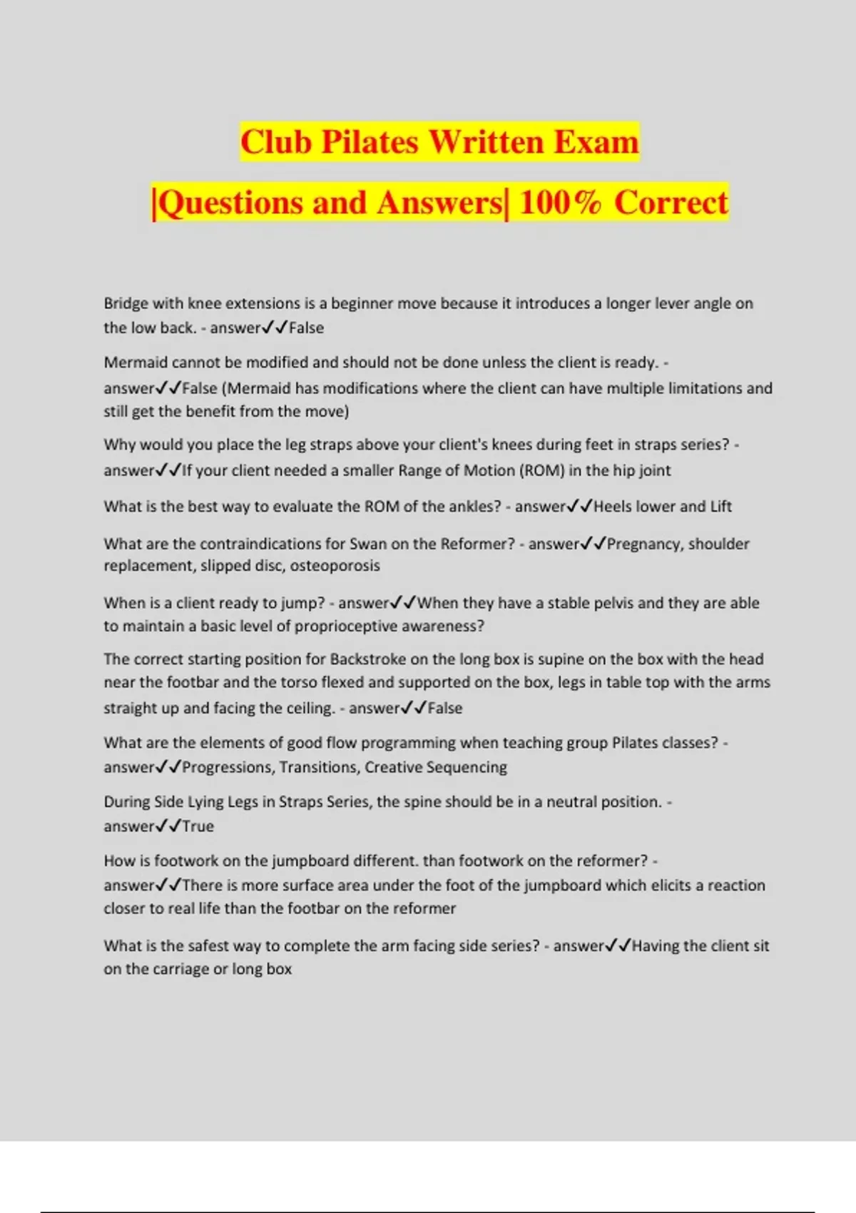 Club Pilates Written Exam |Questions and Answers| 100% Correct Bridge with knee extensions is a beginner move because it introduces a longer lever angle on the low back. - answerFalse Mermaid cannot be modified and should not be done unless the client is ready. - answerFalse (Mermaid has modifications where the client can have multiple limitations and still get the benefit from the move) Why would you place the leg straps above your client's knees during feet in straps series? - answerIf your client needed a smaller Range of Motion (ROM) in the hip joint What is the best way to evaluate the ROM of the ankles? - answerHeels lower and Lift What are the contraindications for Swan on the Reformer? - answerPregnancy, shoulder replacement, slipped disc, osteoporosis When is a client ready to jump? - answerWhen they have a stable pelvis and they are able to maintain a basic level of proprioceptive awareness? The correct starting position for Backstroke on the long box is supine on the box with the head near the footbar and the torso flexed and supported on the box, legs in table top with the arms straight up and facing the ceiling. - answerFalse What are the elements of good flow programming when teaching group Pilates classes? - answerProgressions, Transitions, Creative Sequencing During Side Lying Legs in Straps Series, the spine should be in a neutral position. - answerTrue How is footwork on the jumpboard different. than footwork on the reformer? - answerThere is more surface area under the foot of the jumpboard which elicits a reaction closer to real life than the footbar on the reformer What is the safest way to complete the arm facing side series? - answerHaving the client sit on the carriage or long box What are the major muscles emphasized in supine arms in straps series? - answerTransverse abdominis for stabilization, hip flexors to hold legs in place and latissimus dorsi & the long head of the tricep for arm movement What is the most advanced variation of Bridge and why? - answerSemi circle - it incorporates multiple variations of spinal articulations and requires a client to have impeccable proprioceptive awareness What are the four main muscles emphasized during footwork on the reformer? - answerTransverse Abdominis, Contralateral Obliques, Glutes, Hamstrings Clients should always be in thoracic extension when jumping supine on the jumpboard? - answerFalse Pick the correct list of possible matwork variations that could be taught on the reformer with arms in straps. - answerSingle leg stretch, Double leg stretch, Lower and lift, Scissors, Helicopters, Criss-Cross, Frogs How many springs should be on during Short Box Series? - answerALL springs Pulling Straps Series develops posterior chain strength which beneficial for better posture. - answerTrue (make sure that you always tell your clients the "why" behind the move) Footwork on the reformer shows the instructor key indicators of how the client's functional patterns may have created misalignments - answerTrue For a client who has valgus knees, what is the most effective positioning and prop to use during footwork? - answerFeet parallel, Magic Circle at the outside of the upper knee area Pick the correct group of contraindications for articulation during Bridge on the Reformer. - answerPregnancy, hip replacements, slipped disc, osteoporosis Bridge variations on the Reformer strengthen the back muscles and posterior chain overall. - answerTrue The postural muscles are stabilizers during Presentation. - answerTrue (Yes, the postural muscles keep the body from swaying during the movement) For Supine Arms in Straps series, the safest client progression would be in what order? - answerStart with head down & legs in table top, then progress to thoracic flexion with arm movement, followed by maintaining thoracic flexion the entire time and legs in extension. Supine Arms in Straps Lower and Lift is done in which plane of motion? - answerAll planes Full Teaser on the reformer is performed on the Short Box. - answerFalse (Full Teaser should be done on the long bo