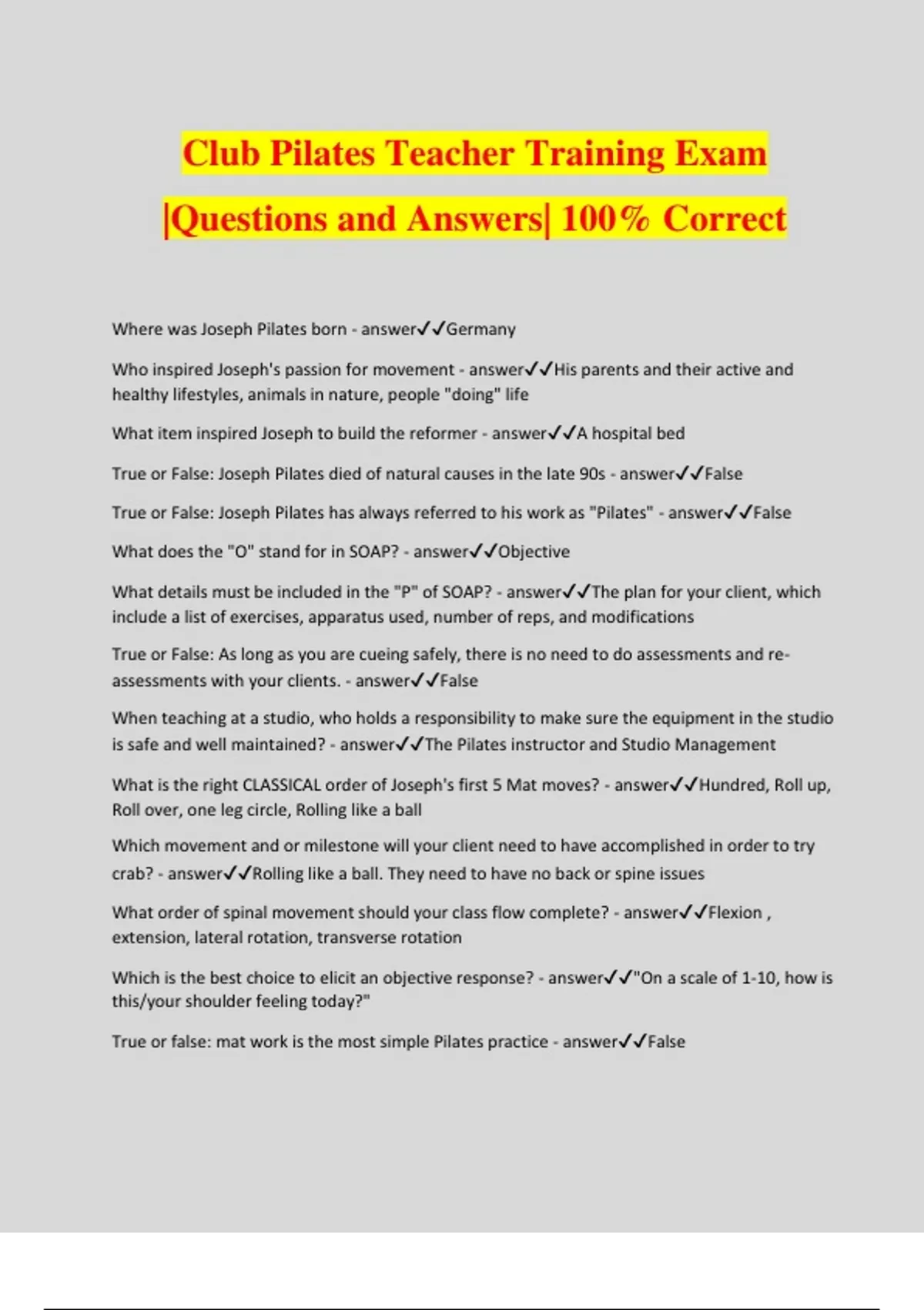 Club Pilates Teacher Training Exam |Questions and Answers| 100% Correct Where was Joseph Pilates born - answerGermany Who inspired Joseph's passion for movement - answerHis parents and their active and healthy lifestyles, animals in nature, people "doing" life What item inspired Joseph to build the reformer - answerA hospital bed True or False: Joseph Pilates died of natural causes in the late 90s - answerFalse True or False: Joseph Pilates has always referred to his work as "Pilates" - answerFalse What does the "O" stand for in SOAP? - answerObjective What details must be included in the "P" of SOAP? - answerThe plan for your client, which include a list of exercises, apparatus used, number of reps, and modifications True or False: As long as you are cueing safely, there is no need to do assessments and re- assessments with your clients. - answerFalse When teaching at a studio, who holds a responsibility to make sure the equipment in the studio is safe and well maintained? - answerThe Pilates instructor and Studio Management What is the right CLASSICAL order of Joseph's first 5 Mat moves? - answerHundred, Roll up, Roll over, one leg circle, Rolling like a ball Which movement and or milestone will your client need to have accomplished in order to try crab? - answerRolling like a ball. They need to have no back or spine issues What order of spinal movement should your class flow complete? - answerFlexion , extension, lateral rotation, transverse rotation Which is the best choice to elicit an objective response? - answer"On a scale of 1-10, how is this/your shoulder feeling today?" True or false: mat work is the most simple Pilates practice - answerFalse What would be a good example of using "P" in PEACE R&R? - answer"Start in supine, on your back with your heel's on the center of the foot bar about three inches apart. Your back should be relaxed and your shoulders should not be pressing against the rests" True or False: Always suggest that clients use a thin mat or towel for their mat classes. It doesn't have to be a thick mat, it should just cover the area under your clients body. - answerFalse What is the best way to warm up a class of elderly persons? - answerGround based pelvic rocks followed by single leg stretch keeping the head down. What exercises should your client master before trying the boomerang? - answerRoll over and teaser After warming up my small group mat class, I plan on having them do _____________to get the back of their bodies and then ____________ to get the front of their bodies - answerBridge variations and hundreds True or False: Having both legs in table top is considered a close kinetic chain and this is good for clients with low back issues - answerFalse You are evaluating a client for the first time and find they have a major anterior tilt in their pelvis and no injuries in the past. They have been cleared to start a fitness routine after having not worked out in the past 4 years. What moves would you teach them in their first work out? - answerBridge, roll up, Quadruped True or false: during chest lift, the client should maintain their neutral pelvis - answerTrue During teaser, how does bending the knees into the chest change the exercise? - answerBending the knees into the chest changes the intention of the exercise. Your client might not be ready for teaser. Once they master various teaser prep exercises for the fundamentals of the exercise, you can progress them to the full teaser exercise. In what plane of motion is the hundred? - answerSagittal Which method of journaling do we suggest using the course? - answerRapid fire journaling True or false: Pilates metrics has all of the entire exercise library uploaded in it so that I can utilize it for helping me do my practice teaching hours, observation hours, assistant teaching and self practice - answerTrue What is the best order of movement to start with if you your client had an old injury, works all the time and is "just getting back to moving?" - answerRoll down, footwork, bridge variation, hands in straps/supine abs var