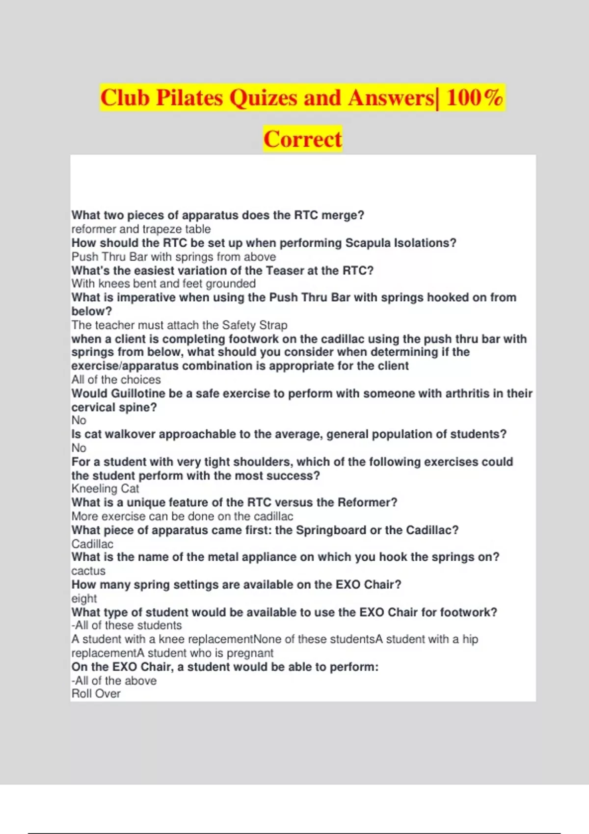 Club Pilates Quizes and Answers| 100% Correct What two pieces of apparatus does the RTC merge? reformer and trapeze table How should the RTC be set up when performing Scapula Isolations? Push Thru Bar with springs from above What's the easiest variation of the Teaser at the RTC? With knees bent and feet grounded What is imperative when using the Push Thru Bar with springs hooked on from below? The teacher must attach the Safety Strap when a client is completing footwork on the cadillac using the push thru bar with springs from below, what should you consider when determining if the exercise/apparatus combination is appropriate for the client All of the choices Would Guillotine be a safe exercise to perform with someone with arthritis in their cervical spine? No Is cat walkover approachable to the average, general population of students? No For a student with very tight shoulders, which of the following exercises could the student perform with the most success? Kneeling Cat What is a unique feature of the RTC versus the Reformer? More exercise can be done on the cadillac What piece of apparatus came first: the Springboard or the Cadillac? Cadillac What is the name of the metal appliance on which you hook the springs on? cactus How many spring settings are available on the EXO Chair? eight What type of student would be available to use the EXO Chair for footwork? -All of these students A student with a knee replacementNone of these studentsA student with a hip replacementA student who is pregnant On the EXO Chair, a student would be able to perform: -All of the above Roll Over None of the above Swan Mermaid When performing any standing work on the EXO Chair, where should the EXO Chair be placed? Near the teacher and something stable and supportive What exercise would be safest for a beginning student to attempt on the EXO Chair? Seated footwork If a student is supinating their feet while performing seated footwork on the EXO Chair, what suggestion might you offer? Offer them a prop like a ball to help their foot and ankle alignment What exercises can be performed on the EXO Chair? Teaser Side Bends cat Bridge Plank If a student is 6 feet tall and has a hip replacement, what adjustments might you make so the student could attempt seated footwork on the EXO Chair? Lower the pedal and edit the springs Which of the following students would not be permitted to attempt pikes on the chair A prenatal student A student with vertigo a first-time student a student with osteoporosis What nickname does the Spine Corrector have? Barrel Small Barrel Pilates Arc All of these nicknames What pieces make up the anatomy of the Spine Corrector? The Barrel and the Step What exercise cannot be performed on the Spine Corrector?