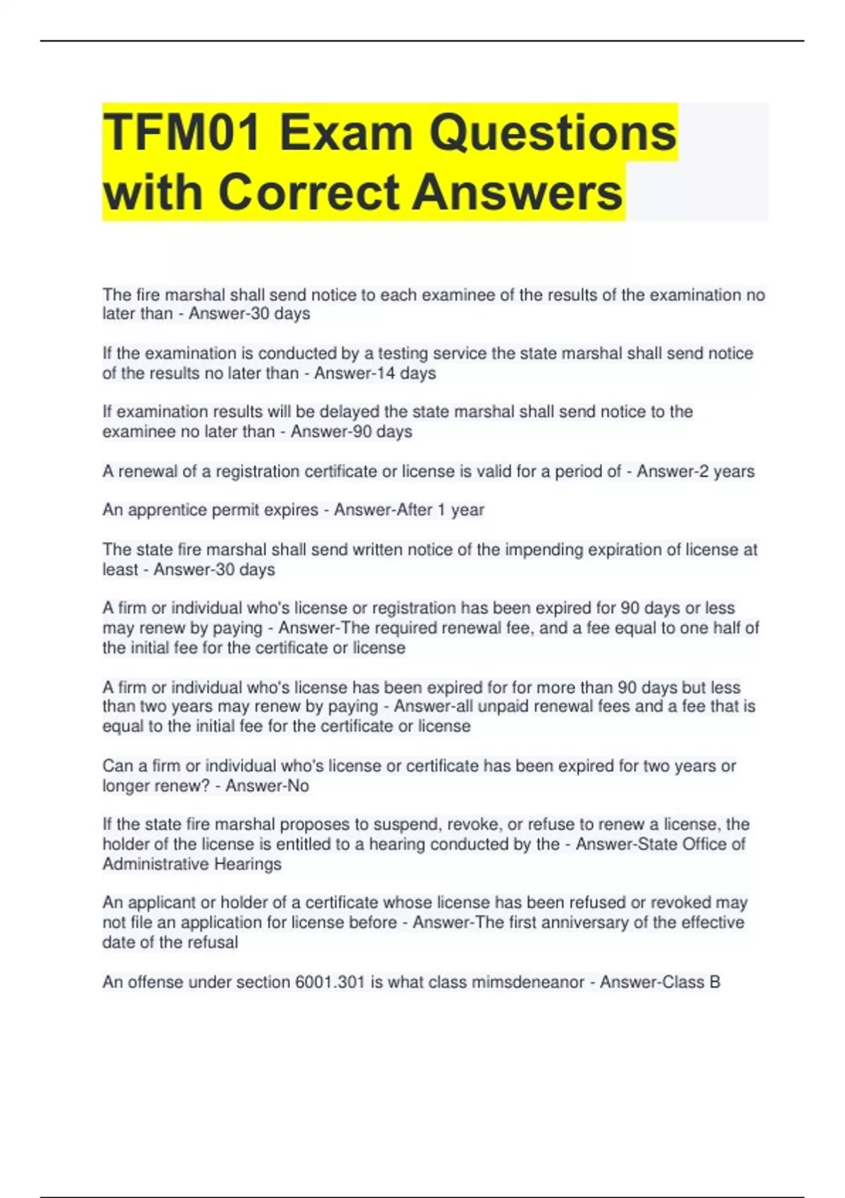 TFM01 Exam Questions with Correct Answers The fire marshal shall send notice to each examinee of the results of the examination no later than - Answer-30 days If the examination is conducted by a testing service the state marshal shall send notice of the results no later than - Answer-14 days If examination results will be delayed the state marshal shall send notice to the examinee no later than - Answer-90 days A renewal of a registration certificate or license is valid for a period of - Answer-2 years An apprentice permit expires - Answer-After 1 year The state fire marshal shall send written notice of the impending expiration of license at least - Answer-30 days A firm or individual who's license or registration has been expired for 90 days or less may renew by paying - Answer-The required renewal fee, and a fee equal to one half of the initial fee for the certificate or license A firm or individual who's license has been expired for for more than 90 days but less than two years may renew by paying - Answer-all unpaid renewal fees and a fee that is equal to the initial fee for the certificate or license Can a firm or individual who's license or certificate has been expired for two years or longer renew? - Answer-No If the state fire marshal proposes to suspend, revoke, or refuse to renew a license, the holder of the license is entitled to a hearing conducted by the - Answer-State Office of Administrative Hearings An applicant or holder of a certificate whose license has been refused or revoked may not file an application for license before - Answer-The first anniversary of the effective date of the refusal