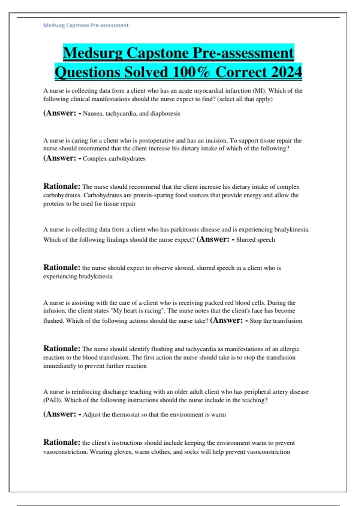 Medsurg Capstone Pre-assessment Questions Solved 100% Correct 2024