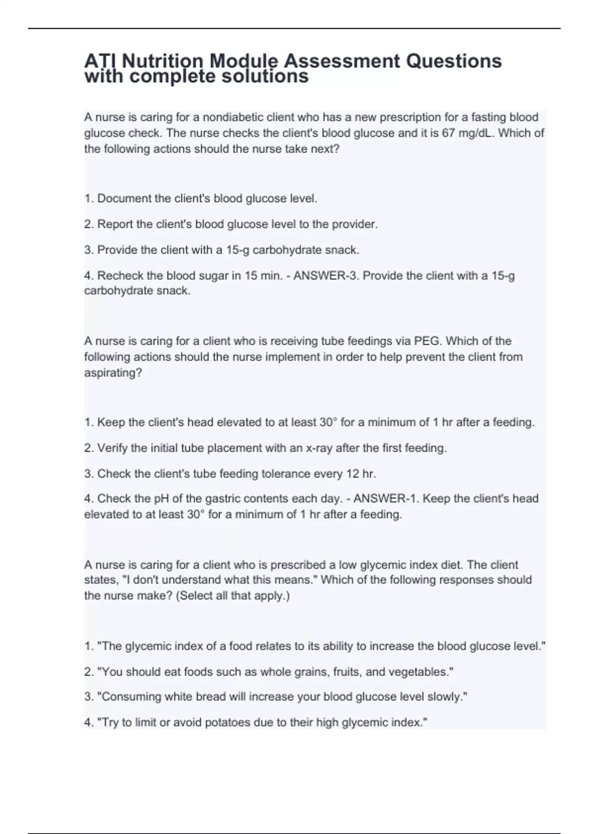 A nurse is caring for a client who is receiving tube feedings via PEG. Which of the following actions should the nurse implement in order to help prevent the client from A nurse is caring for a nondiabetic client who has a new prescription for a fasting blood glucose check. The nurse checks the client's blood glucose and it is 67 mg/dL. Which of the following actions should the nurse take next? 1. Document the client's blood glucose level. 2. Report the client's blood glucose level to the provider. 3. Provide the client with a 15-g carbohydrate snack. 4. Recheck the blood sugar in 15 min. - ANSWER-3. Provide the client with a 15-g carbohydrate snack. aspirating? 1. Keep the client's head elevated to at least 30° for a minimum of 1 hr after a feeding. 2. Verify the initial tube placement with an x-ray after the first feeding. 3. Check the client's tube feeding tolerance every 12 hr. 4. Check the pH of the gastric contents each day. - ANSWER-1. Keep the client's head elevated to at least 30° for a minimum of 1 hr after a feeding. A nurse is caring for a client who is prescribed a low glycemic index diet. The client states, "I don't understand what this means." Which of the following responses should the nurse make? (Select all that apply.) 1. "The glycemic index of a food relates to its ability to increase the blood glucose level." 2. "You should eat foods such as whole grains, fruits, and vegetables." 3. "Consuming white bread will increase your blood glucose level slowly." 4. "Try to limit or avoid potatoes due to their high glycemic index." 5. "Foods with a high glycemic index will cause your blood glucose to increase rapidly." - ANSWER-1. "The glycemic index of a food relates to its ability to increase the blood glucose level."