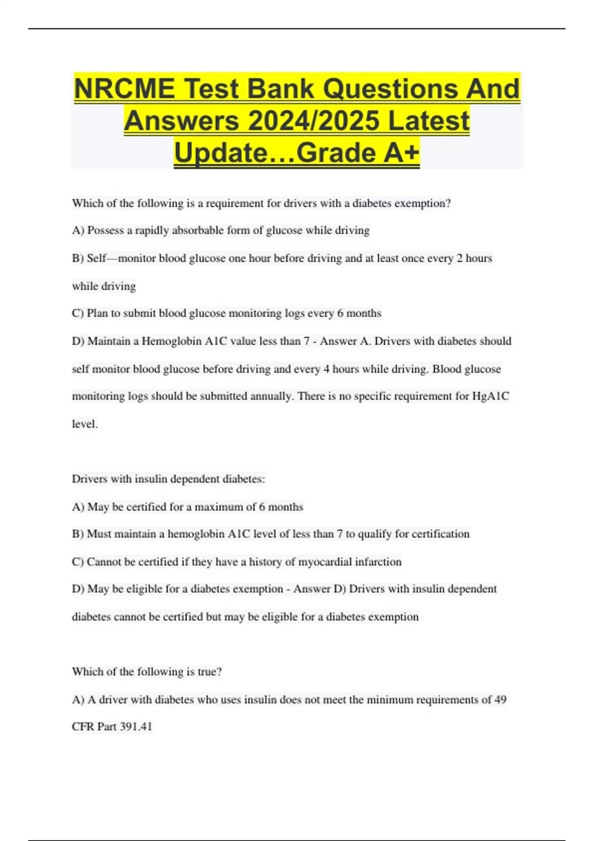 NRCME Test Bank Questions And Answers 2024/2025 Latest Update…Grade A+ Which of the following is a requirement for drivers with a diabetes exemption? A) Possess a rapidly absorbable form of glucose while driving B) Self—monitor blood glucose one hour before driving and at least once every 2 hours while driving C) Plan to submit blood glucose monitoring logs every 6 months D) Maintain a Hemoglobin A1C value less than 7 - Answer A. Drivers with diabetes should self monitor blood glucose before driving and every 4 hours while driving. Blood glucose monitoring logs should be submitted annually. There is no specific requirement for HgA1C level. Drivers with insulin dependent diabetes: A) May be certified for a maximum of 6 months B) Must maintain a hemoglobin A1C level of less than 7 to qualify for certification C) Cannot be certified if they have a history of myocardial infarction D) May be eligible for a diabetes exemption - Answer D) Drivers with insulin dependent diabetes cannot be certified but may be eligible for a diabetes exemption Which of the following is true? A) A driver with diabetes who uses insulin does not meet the minimum requirements of 49 CFR Part 391.41