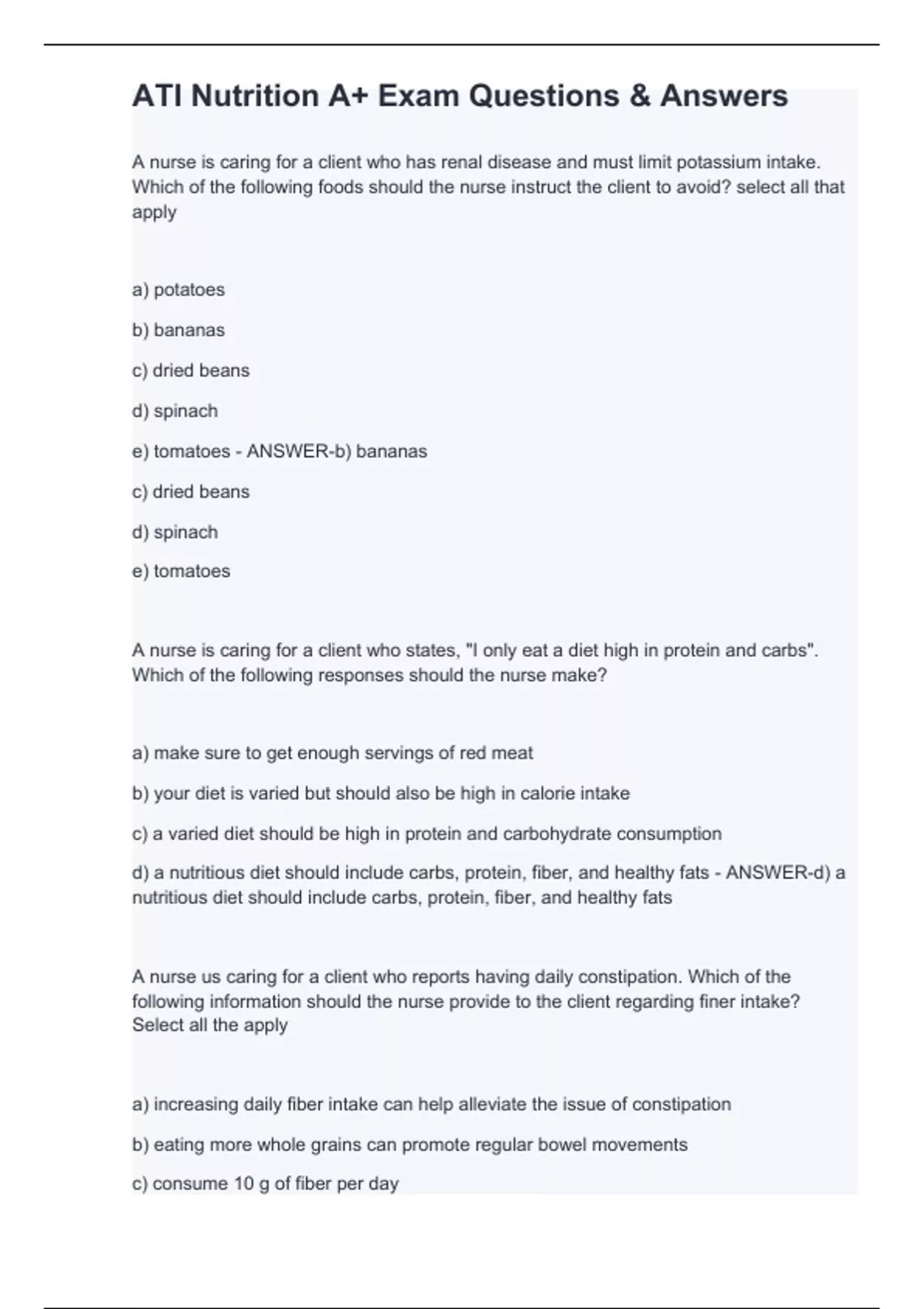 A nurse is caring for a client who has renal disease and must limit potassium intake. Which of the following foods should the nurse instruct the client to avoid? select all that apply a) potatoes b) bananas c) dried beans d) spinach e) tomatoes - ANSWER-b) bananas c) dried beans d) spinach e) tomatoes A nurse is caring for a client who states, "I only eat a diet high in protein and carbs". Which of the following responses should the nurse make? a) make sure to get enough servings of red meat b) your diet is varied but should also be high in calorie intake c) a varied diet should be high in protein and carbohydrate consumption d) a nutritious diet should include carbs, protein, fiber, and healthy fats - ANSWER-d) a nutritious diet should include carbs, protein, fiber, and healthy fats A nurse us caring for a client who reports having daily constipation. Which of the following information should the nurse provide to the client regarding finer intake? Select all the apply a) increasing daily fiber intake can help alleviate the issue of constipation b) eating more whole grains can promote regular bowel movements c) consume 10 g of fiber per day d) foods such as white rice increase fiber intake e) decreasing daily fiber intake can help alleviate digestive discomfort - ANSWER-a) increasing daily fiber intake can help alleviate the issue of constipation