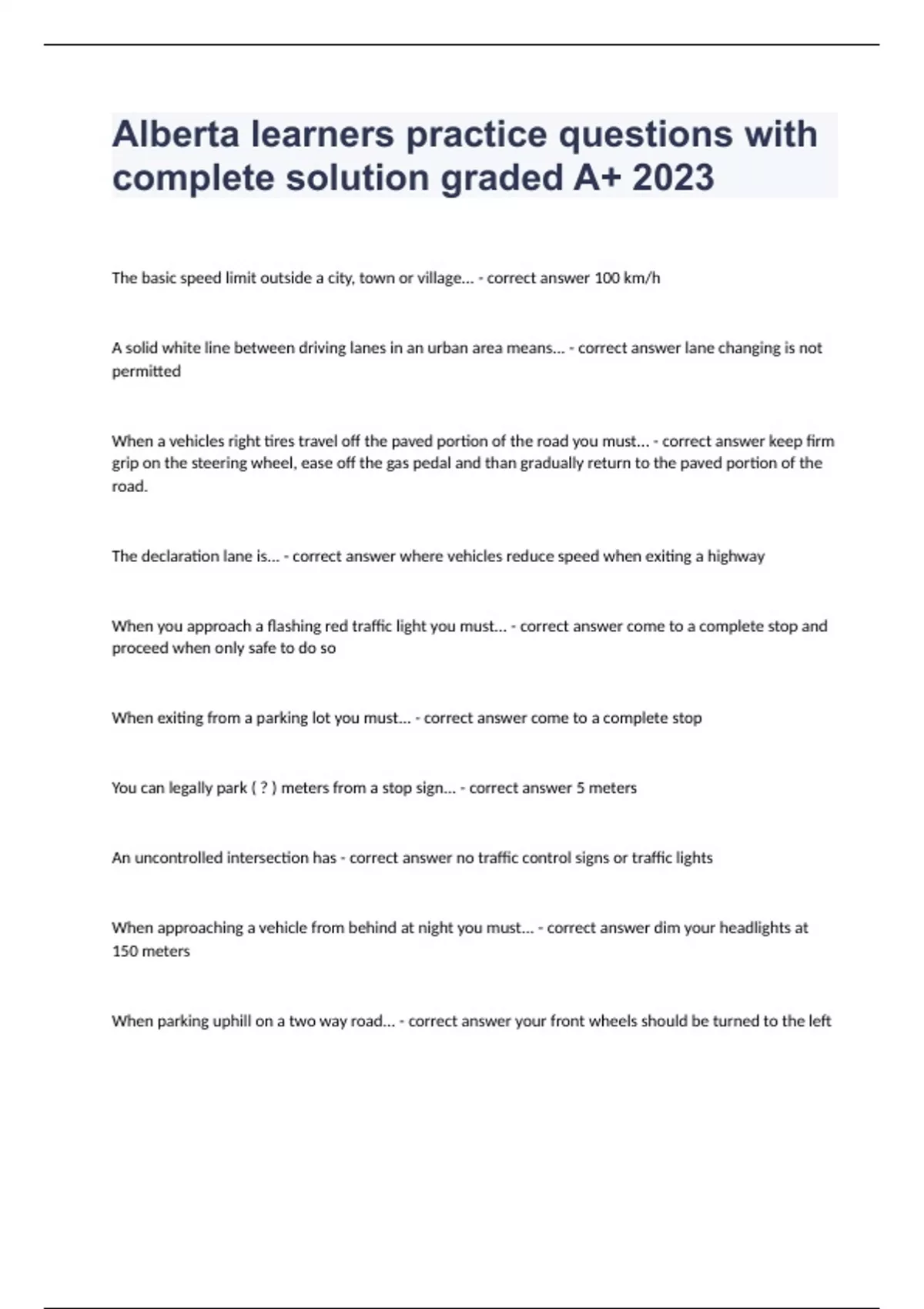 Alberta learners practice questions and answers already passed 2024The basic speed limit outside a city, town or village... - correct answer 100 km/h A solid white line between driving lanes in an urban area means... - correct answer lane changing is not permitted When a vehicles right tires travel off the paved portion of the road you must... - correct answer keep firm grip on the steering wheel, ease off the gas pedal and than gradually return to the paved portion of the road. The declaration lane is... - correct answer where vehicles reduce speed when exiting a highway When you approach a flashing red traffic light you must... - correct answer come to a complete stop and proceed when only safe to do so When exiting from a parking lot you must... - correct answer come to a complete stop You can legally park ( ? ) meters from a stop sign... - correct answer 5 meters An uncontrolled inter