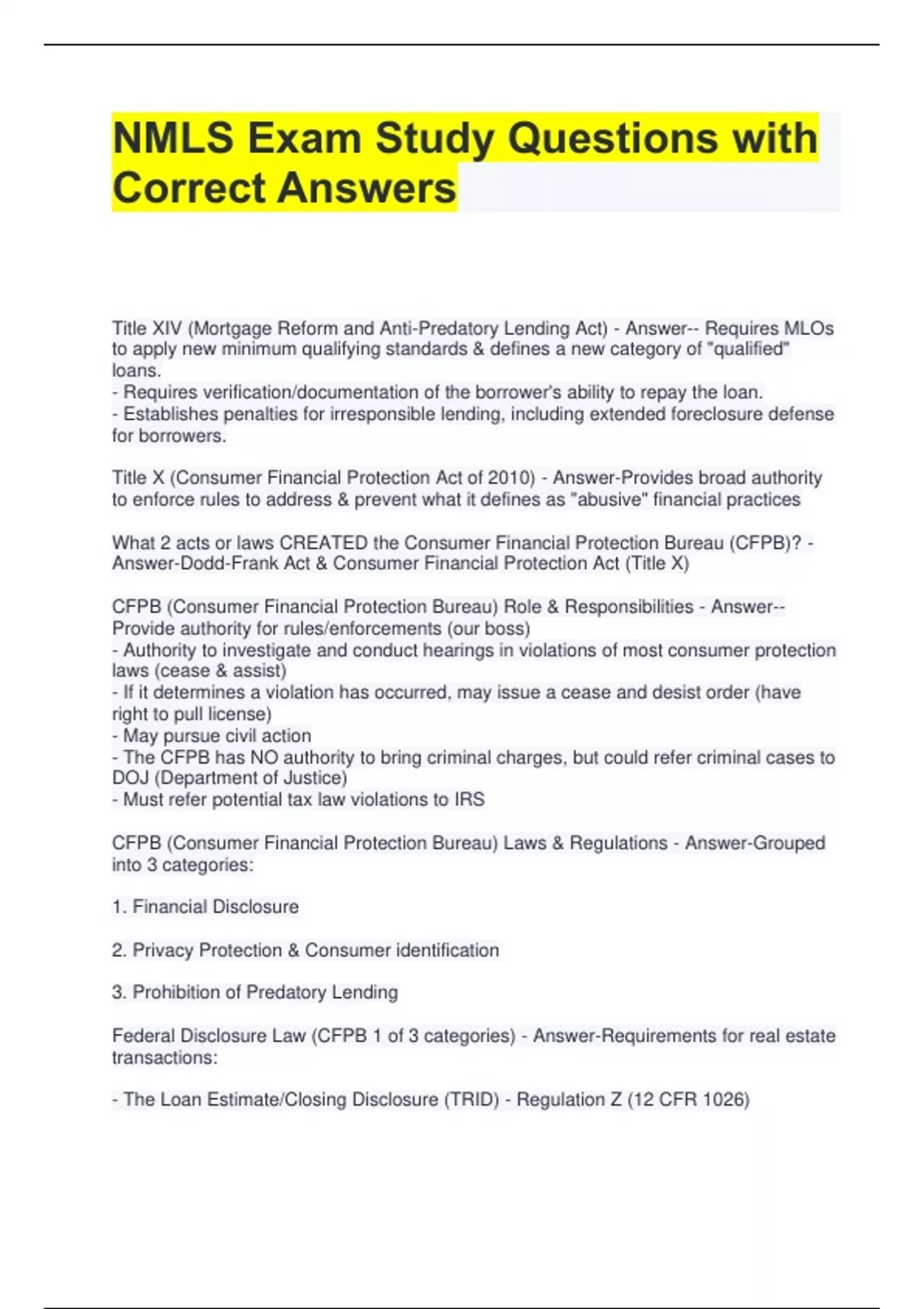 NMLS Exam Study Questions with Correct Answers Title XIV (Mortgage Reform and Anti-Predatory Lending Act) - Answer-- Requires MLOs to apply new minimum qualifying standards & defines a new category of "qualified" loans. - Requires verification/documentation of the borrower's ability to repay the loan. - Establishes penalties for irresponsible lending, including extended foreclosure defense for borrowers. Title X (Consumer Financial Protection Act of 2010) - Answer-Provides broad authority to enforce rules to address & prevent what it defines as "abusive" financial practices What 2 acts or laws CREATED the Consumer Financial Protection Bureau (CFPB)? - Answer-Dodd-Frank Act & Consumer Financial Protection Act (Title X) CFPB (Consumer Financial Protection Bureau) Role & Responsibilities - Answer-- Provide authority for rules/enforcements (our boss) - Authority to investigate and conduct hearings in violations of most consumer protection laws (cease & assist) - If it determines a violation has occurred, may issue a cease and desist order (have right to pull license) - May pursue civil action - The CFPB has NO authority to bring criminal charges, but could refer criminal cases to DOJ (Department of Justice) - Must refer potential tax law violations to IRS
