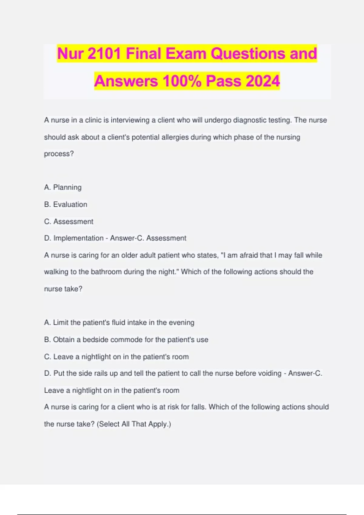 Nur 2101 Final Exam Questions and Answers 100% Pass 2024 A nurse in a clinic is interviewing a client who will undergo diagnostic testing. The nurse should ask about a client's potential allergies during which phase of the nursing process? A. Planning B. Evaluation C. Assessment D. Implementation - Answer-C. Assessment A nurse is caring for an older adult patient who states, "I am afraid that I may fall while walking to the bathroom during the night." Which of the following actions should the nurse take? A. Limit the patient's fluid intake in the evening B. Obtain a bedside commode for the patient's use C. Leave a nightlight on in the patient's room D. Put the side rails up and tell the patient to call the nurse before voiding - Answer-C. Leave a nightlight on in the patient's room A nurse is caring for a client who is at risk for falls. Which of the following actions should the nurse take? (Select All That Apply.) A. Keep the clients room dark at night B. Teach the client to use the call light C. Keep the clients bed in the lowest position D. Place a fall risk identification band on the client's wrist E. Assess the client every 4 hours - Answer-B. Teach the client to use the call light C. Keep the clients bed in the lowest position D. Place a fall risk identification band on the clients wrist A nurse is completing a client's history and physical examination. Which of the following information should the nurse consider subjective data? A. Blood pressure B. Cyanosis C. Nausea D. Petechiae - Answer-C. Nausea A nurse is reviewing information about the health insurance portability and accountability act (HIPAA) with a newly licensed nurse. Which of the following statements by the newly licensed nurse indicates a need for further teaching? A. Information about a patient can be disclosed to a family member at any time B. HIPAA established regulations of individually identifiable health information in verbal, electronic, or written form C. A patients address would be an example of personally identifiable information D. HIPAA is a federal law not a state law - Answer-A. Information about a patient can be disclosed to a family member at any time A nurse is giving a presentation about patient confidentiality to a group of newly licensed nurses. Which of the following actions is an example of a violation of confidentiality? A. Discussing a patients surgical procedure with the nurse manager B. Notifying the provider of physical examination findings C. Identifying the patient by name when making a referral for home health services D. Reporting laboratory findings to a member of the patient's family - Answer-D. Reporting laboratory findings to a member of the patient's family A nurse is receiving change of shift report for a group of assigned patients. The nurse anticipates which of the following activities first in delivering patient care using the nursing process? A. Critically analyze patient data to determine priorities B. Collect and organize patient data C. Set patient centered measurable and realistic goals D. Determine effectiveness of interventions - Answer-B. Collect and organize patient data A nurse is caring for a group of patients on a medical surgical unit. Which of the following situations requires that the nurse wear gloves (Select All That Apply.) A. Emptying urine from an indwelling urine collection bag B. Providing oral care C. Changing an ostomy pouch D. Delivering a food tray to a patient who has AIDS E. Placing oral medication tablets into a patient's hand - Answer-A. Emptying urine from an indwelling urine collection bag B. Providing oral care C. Changing an ostomy pouch A nurse is caring for a patient who has an infection. The nurse should use which of the following strategies to prevent the transmission of the patients infection? A. Changing the patients bed lines each day B. Encouraging the patient to consume a high protein diet C. Performing hand hygiene before, during and after direct contact with the patient D. Placing the patient in a room with positive pressure airflow - Answer-C. Performing hand hygiene before, during, and after direct contact with he patient A nurse is instructing a young adult patient about helpful sleep habits. Which of the following statements should the nurse identify as an indication that the patient needs further teaching? A. I dont take naps throughout the day B. I go to bed and get up routinely at the same time each day C. I have a small snack and take a bath before going to bed each day D. I watch television until i fall asleep at night - Answer-D. I watch television until I fall asleep at night A nurse is teaching a patient who has constipation. Which of the following should the nurse discuss as causes of constipation? (Select All That Apply) A. Excessive laxative use B. Ignoring the urge to defecate C. Inadequate fluid intake D. Increased fiber in the diet E. Increased activity - Answer-A. Excessive laxative use B. Ignoring the urge to defecate C. Inadequate fluid intake A nurse is caring for a patient who is postoperative following a n appendectomy. The surgeon initially prescribes a clear liquid diet. Which of the following items should the nurse offer the patient? (Select All That Apply) A. Broth B. Grape Juice C. Nonfat milk D. Custard E. Lemon Gelatin - Answer-A. Broth B. Grape Juice E. Lemon Gelatin A nurse is caring for a patient who is 1 day postoperative following gynecologic surgery and reports incisional pain. Which of the following action should the nurse take first? A. Determine the time the patient last received pain medication B. Measure the patients vital signs, including temperature C. Ask the patient to rate her pain on a scale from 0-10 D. Reposition the patient and offer her a back rub - Answer-C. Ask the patient to rate her pain on a scale from 0-10 A nurse is developing the plan of care for a patient that does not speak the same language as the nurse. Which of the following interventions should the nurse include? A. Mak