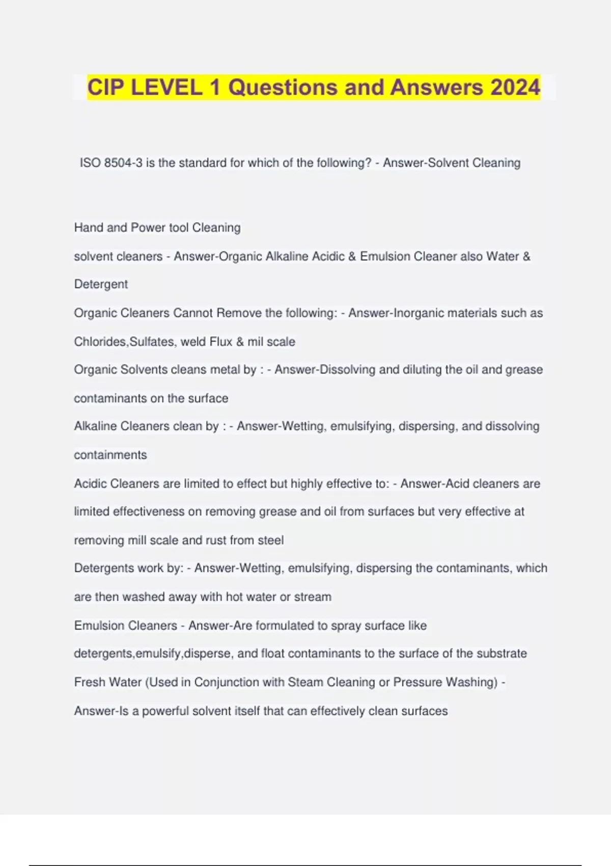 CIP LEVEL 1 Questions and Answers 2024 ISO 8504-3 is the standard for which of the following? - Answer-Solvent Cleaning Hand and Power tool Cleaning solvent cleaners - Answer-Organic Alkaline Acidic & Emulsion Cleaner also Water & Detergent Organic Cleaners Cannot Remove the following: - Answer-Inorganic materials such as Chlorides,Sulfates, weld Flux & mil scale Organic Solvents cleans metal by : - Answer-Dissolving and diluting the oil and grease contaminants on the surface Alkaline Cleaners clean by : - Answer-Wetting, emulsifying, dispersing, and dissolving containments Acidic Cleaners are limited to effect but highly effective to: - Answer-Acid cleaners are limited effectiveness on removing grease and oil from surfaces but very effective at removing mill scale and rust from steel Detergents work by: - Answer-Wetting, emulsifying, dispersing the contaminants, which are then washed away with hot water or stream Emulsion Cleaners - Answer-Are formulated to spray surface like detergents,emulsify,disperse, and float contaminants to the surface of the substrate Fresh Water (Used in Conjunction with Steam Cleaning or Pressure Washing) - Answer-Is a powerful solvent itself that can effectively clean surfaces Wipe test is use for ? - Answer-To detect any remaining residue on clean surfaces. Ultraviolet (UV) Light Test is ? - Answer-Use to detect oil or grease in small quantities on cleaned surfaces. What is a Water Break Test ? - Answer-It's a test used to detect oil on the surface if oil is present it will form droplets or large blotchy areas Surface Dust Test - Answer-Determines the quantity and size of dust left on the surface by simply removing the dust tape ,if dust is left it can reduce coating adhesion leading to premature coating failure . Potassium Ferricyanide Test is ? - Answer-A qualitative test for water -soluble ferrous salts (ions) that is designed to only detect presence on steel substrates. Salt meter is a method ? - Answer-That is faster than Bresle patch but is equivalent . An conductivity test measures ? - Answer-Measures the conductivity of a solution that contains chloride. Hand tools manually involves what ,and can typically remove all loose mill scale, coatings rust and other loose detrimental materials - Answer-It involves manually chipping, scrapping , brushing and sanding surface to remove foreign material . Power Tool Cleaning : - Answer-Can remove loosely (SSPC-SP 3) and tightly adherent SSPC-SP 11 & SP 15 Mill scale is : - Answer-A brittle or flaking layer of iron oxide that is formed on the surface of steel during the hot rolling process. SSPC-SP 2 : - Answer-Is hand tool cleaning; when viewed without magnification shall be free of visible deposits oil grease, and all loose mill scale, loose rust ,loose paint ,& other foreign matters