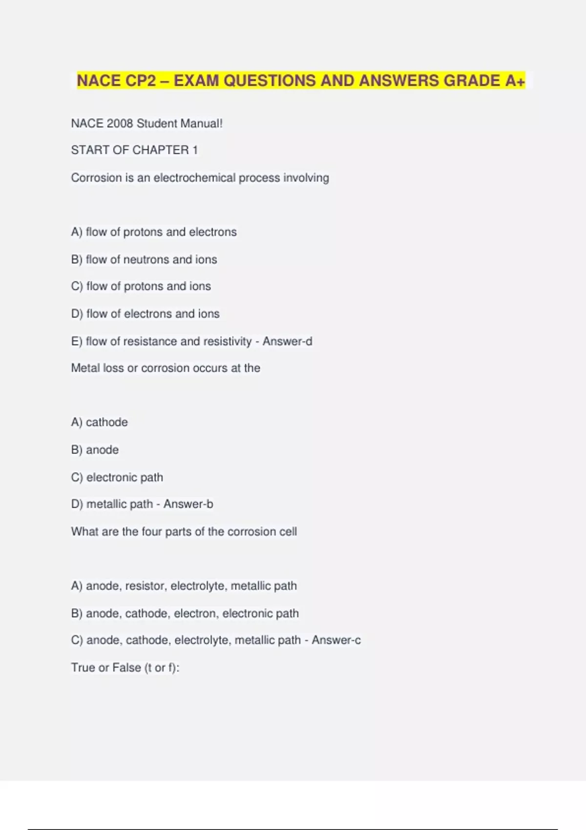 NACE CP2 – EXAM QUESTIONS AND ANSWERS GRADE A+ NACE 2008 Student Manual! START OF CHAPTER 1 Corrosion is an electrochemical process involving A) flow of protons and electrons B) flow of neutrons and ions C) flow of protons and ions D) flow of electrons and ions E) flow of resistance and resistivity - Answer-d Metal loss or corrosion occurs at the A) cathode B) anode C) electronic path D) metallic path - Answer-b What are the four parts of the corrosion cell A) anode, resistor, electrolyte, metallic path B) anode, cathode, electron, electronic path C) anode, cathode, electrolyte, metallic path - Answer-c True or False (t or f): Ions exist only in the electrolyte? - Answer-t Electrons flow in a corrosion cell by which of the following paths? A) anode to cathode via electrolyte B) cathode to anode via electronic path C) anode to cathode via electronic path - Answer-c At the cathodic surface in a corrosion cell, the electrons from the ____ meet ____ ions from the solution. A) cathode, hydrogen B) cathode, OH- C) anode, hydrogen D) anode, OH- - Answer-c Oxidation of the metal occurs at the ____ surfaces and reduction of ____ ions occurs at the ____. A) anodic, hydrogen, cathodes B) cathode, OH-, anodic C) anodic, OH-, cathodes D) cathode, anodic, electrolyte E) cathode, hydrogen, electrolyte - Answer-a True or false Is oxidation necessarily associated with oxygen? - Answer-f Current flow in a corrosion cell flows which path: A) anode to metallic path to cathode B) anode to electronic path to cathode C) cathode to metallic to anode D) cathode to electrolyte to anode E) anode to electrolyte to cathode Voltage is the measure of the electrochemical difference between two electrodes in an electrolyte - Answer-e _____ is the measure of the electrochemical difference between two electrodes in an electrolyte A) current B) resistance C) error D) ohms E) ohms-cm F) voltage - Answer-f The ________ represents the reversible work to move a unit charge from the electrode surface through the solution to the reference electrode A) current potential B) electrode potential C) resistance potential D) ohms potential E) Faraday potential - Answer-b Metals occur in nature in the form of various chemical compounds referred to as ___ A) ores B) anodic metals C) cathodic metals D) carbohydrates - Answer-a The amount of energy required by a metal during the refining process determines the ___ or _______ of the metal. A) current, active state B) voltage, active state C) active resistance, voltage D) resistance, active state E) current, active resistance - Answer-b During the refining stage of metal the ____ the energy, the more ____ the metal and the more tendency it has to corrode. A) higher, inactive B) lower, active C) higher, active D) lower, inactive - Answer-c What is the most common iron ore? A) hemophite B) hematite C) magnesium D) calcium E) aluminum - Answer-b True or false Iron is considered thermodynamically unstable? - Answer-t True or false Gold is more noble than zinc? - Answer-t Which of the following metals is most active? A) magnesium B) copper C) iron D) nickel E) platinum - Answer-a Electromotive force (emf), is ____ in sign and magnitude to the electrode potential of the ___ less the electrode potential of the ____. A) unequal, cathode, anode B) unequal, anode, cathode C) equal, cathode, anode D) equal, anode, cathode - Answer-d The driving force for electrochemical corrosion is ____ A) current B) voltage C) resistance D) ohms E) siemens-cm - Answer-b In relation to a corrosion cell, ____ is the net transfer of electric charge per unit time A) current B) voltage C) resistance D) ohms E) siemens-cm - Answer-a If a metallic path connects two electrodes inside an electrolyte, the ____ difference will cause a ____ to flow between them A) current, voltage B) resistance, current C) resistance, voltage D) voltage, current E) current, resistance - Answer-d The more useful method of organizing metals in order of their tendency to corrode is _____ A) emf series B) pgp series C) nuclear series D) electron series E) galvanic series - Answer-e The ____ expresses the exact electromotive force of a cell in terms of the activities of products and reactants of the cell A) Ernest Equation B) Faraday Equation C) Ohm's Law Equation D) Nernst Equation E) Uniform Equation - Answer-d Given the Nernst Equation, using the Valence of Common Metals Table, and using the partial Standard emf Series of Metals solve: What is the potential of zinc in a 0.01 molar zinc chloride solution at 25C? A) -0.892V B) -0.287V C) -0.827V D) -0.297V E) -0.889V - Answer-c E= -0.763 + (0.059/2) * log (0.71 *0.01/1) = -0.827V Standard conditions for pure metals in the emf series are based on one unit activity of metal ions in the electrolyte at ___ C with no impurities in the metal or electrolyte and with reference to a stand