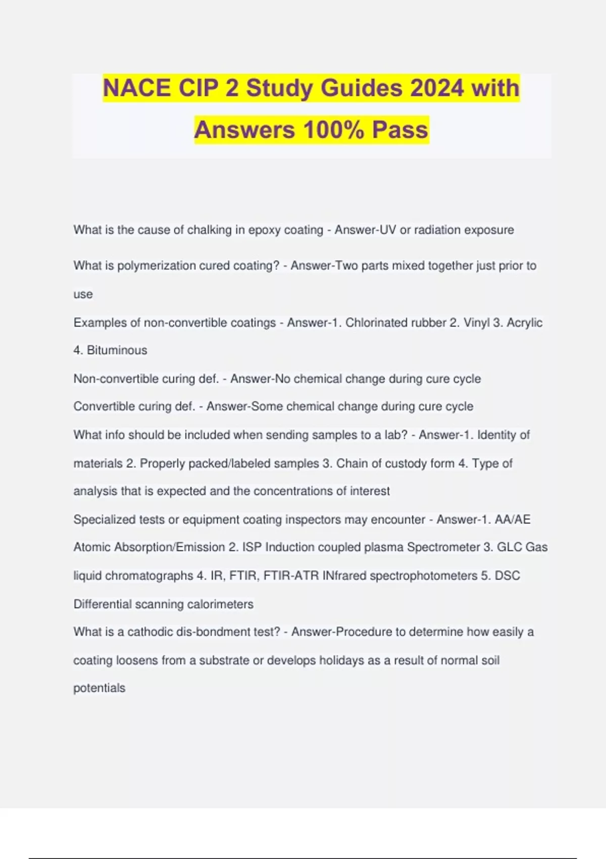 NACE CIP 2 Study Guides 2024 with Answers 100% Pass What is the cause of chalking in epoxy coating - Answer-UV or radiation exposure What is polymerization cured coating? - Answer-Two parts mixed together just prior to use Examples of non-convertible coatings - Answer-1. Chlorinated rubber 2. Vinyl 3. Acrylic 4. Bituminous Non-convertible curing def. - Answer-No chemical change during cure cycle Convertible curing def. - Answer-Some chemical change during cure cycle What info should be included when sending samples to a lab? - Answer-1. Identity of materials 2. Properly packed/labeled samples 3. Chain of custody form 4. Type of analysis that is expected and the concentrations of interest Specialized tests or equipment coating inspectors may encounter - Answer-1. AA/AE Atomic Absorption/Emission 2. ISP Induction coupled plasma Spectrometer 3. GLC Gas liquid chromatographs 4. IR, FTIR, FTIR-ATR INfrared spectrophotometers 5. DSC Differential scanning calorimeters What is a cathodic dis-bondment test? - Answer-Procedure to determine how easily a coating loosens from a substrate or develops holidays as a result of normal soil potentials Individuals who perform surveys - Answer-1. O-Cat or S-cat tech 2. NACE coating specialist 3. NACE Level III 4. Coating Inspector w/field experience 5. Coating manufacturer representative 6. Maintenence engineer with specific plant knowledge. Coating survey steps - Answer-1. Understand scope 2. Gather team 3. Develop survey plan 4. Review standards 5. Agree on format 6. Delegate various tasks 7. Eveluate existing coating 8. Delegate various tasks 9. Evaluate existing coating 10. Gather additional info 11. Summarize data 12. Prepare maintenance plans 13. Prepare reports/input data 14. Submit final survey reports. List some of the primary reasons surveys are performed - Answer-1. Plan maintenance. 2. Prioritize work 3. Budgetary concerns 4. Determine value of assets 5. Legal compliance Definition of a coating survey - Answer-Gather baseline info needed to plan maintenance coating procedures What are faying surfaces and why not galvanize them? - Answer-Surfaces that depend on friction to hold galvanizing it may/will reduce friction if they are galvanized Common problems seen during the usual inspections of HD galvanized items - Answer- 1. Cracking 2. Peeling 3. Bare spots 4. Lumps 5. Blisters 6. Flux inclusions 7. Ash inclusions 8. Dross inclusions Post galvanizing treatments and why - Answer-To Remove Thickness: Roll, Wipe, Centrifuge/Air Blast To change properties/To alloy: Annealing Temperature range for galvanizing kettle - Answer-820-850 F Purpose of pickling - Answer-Hydrochloric or sulfuric acid bath to remove oxides and mill scale Purpose of caustic cleaning - Answer-Acid bath or caustic to remove dirt, oil and grease Stages of hot dip process - Answer-1. Surface prep. 2. Galvanizing 3. Post treatment 4. Inspection Hot dip galvanizing safety - Answer-1. Can stay for some time 2. Molten metal splash 3. Nascent hydrogen above kettle Usual layers of galvanized coating consists of: - Answer-1. ETA=100% Zn 2. ZETA= 94% Zn 6%Fe 3. DELTA= 90% Zn 10 Fe 4. GAMMA= 75% Zn 25% Fe What is hot dip galvanizing? - Answer-Coating iron or steel with zinc at temperatures of 820-860 F If a maintenance coating to be applied is incompatible with the existing coating system__________may occur - Answer-Curling ______________ is performed at the work area by working the edges of the repaired area back to achieve a fairly smooth transition from the repair area to sound coating. - Answer-Feathering With regards to maint. coating all parties should agree on___________? - Answer-1. Spot repair requirements 2. Feathering 3. Appearance of repaired areas Maint. coating selection process should take the following into consideration: - Answer- 1. Compatability with existing system 2. Surface prep. 3. If abrasi ve blast is permitted and feasible