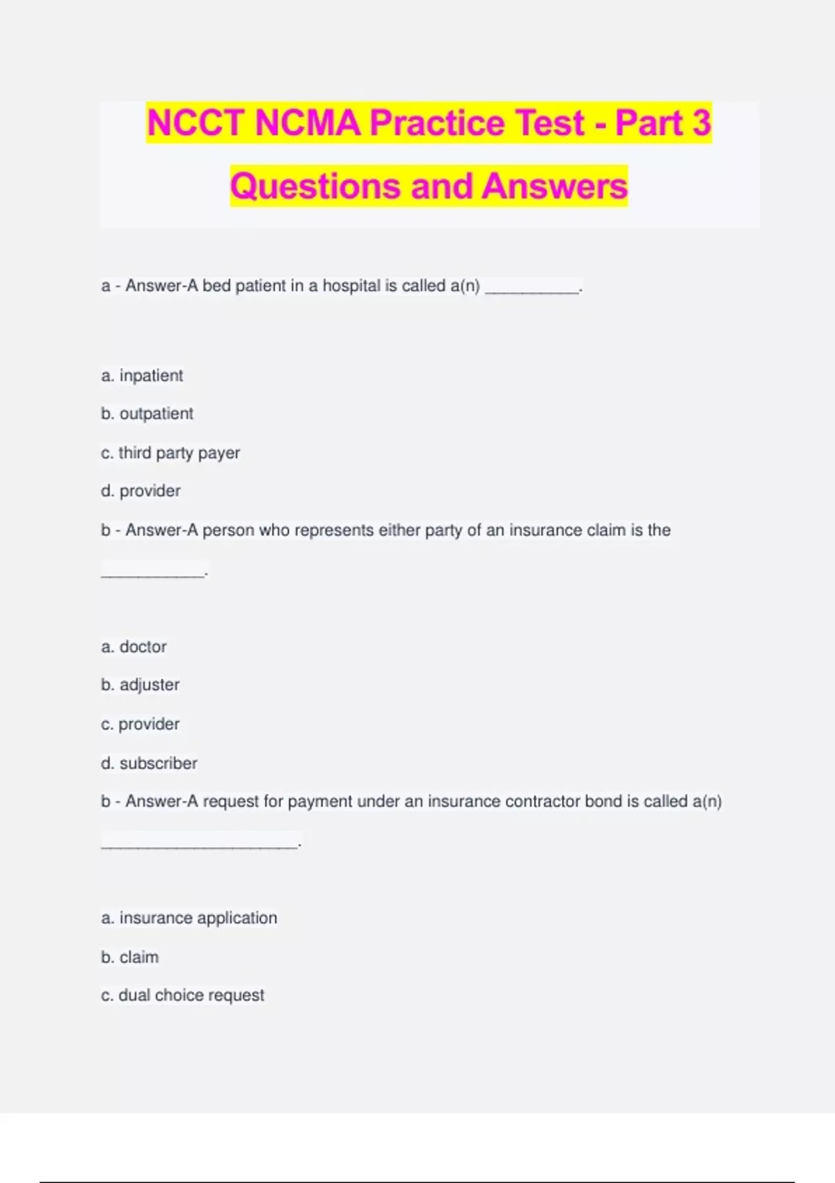 NCCT NCMA Practice Test - Part 3 Questions and Answers a - Answer-A bed patient in a hospital is called a(n) __________. a. inpatient b. outpatient c. third party payer d. provider b - Answer-A person who represents either party of an insurance claim is the ___________. a. doctor b. adjuster c. provider d. subscriber b - Answer-A request for payment under an insurance contractor bond is called a(n) _____________________. a. insurance application b. claim c. dual choice request d. total disability b - Answer-Payment made periodically to keep an insurance policy in force is called ____________. a. time limit b. premium c. coinsurance d. fee-for-service b - Answer-A person or institution that gives medical care is a(n) ____________. a. third-party payer b. provider c. adjuster d. insurance agent a - Answer-Which of the following insurance plans provides a fixed payment per month to the physician, regardless of the services rendered? a. Capitation b. Preferred provider c. Fee for services d. Health maintenance c - Answer-An amount the insured must pay before policy benefits begin is called ____________. a. indemnity b. extended benefits c. deductible d. catastrophic b - Answer-An organization that offers health insurance at a fixed monthly premium with little or no deductible and works through a primary care provider is called a(n) ____________________. a. preferred provider b. health maintenance organization c. member physician d. private health provider a - Answer-Health insurance that provides protection against the high cost of treating severe or lengthy illnesses or disabilities is called _____________. a. catastrophic b. severe c. third-party payer d. no correct answer b - Answer-A patient receiving ambulatory care at a hospital or other health facility without being admitted as a bed patient is called a(n) ___________.