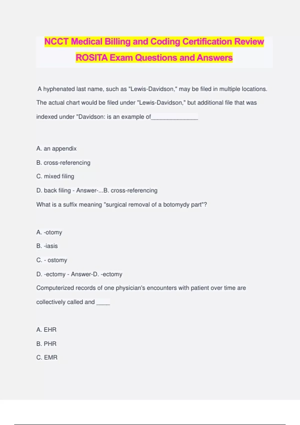 NCCT Medical Billing and Coding Certification Review ROSITA Exam Questions and Answers A hyphenated last name, such as "Lewis-Davidson," may be filed in multiple locations. The actual chart would be filed under "Lewis-Davidson," but additional file that was indexed under "Davidson: is an example of______________ A. an appendix B. cross-referencing C. mixed filing D. back filing - Answer-...B. cross-referencing What is a suffix meaning "surgical removal of a botomydy part"? A. -otomy B. -iasis C. - ostomy D. -ectomy - Answer-D. -ectomy Computerized records of one physician's encounters with patient over time are collectively called and ____ A. EHR B. PHR C. EMR D. AC - Answer-...A. EHR What is the second step of medical history taking, a concise statement describing the reason a patient came into the office, hospital or clinic? A. chief complaint B. Sysptom C. problem D. diagnosis - Answer-. chief complaint Appendix A in the ICD-9 concerns itself with the _____ A. Morphology of Neoplasms B. Classification of Drugs C. Classification of Industrial Accidents D. Glossary of Metal Disorders - Answer-A. Morphology of Neoplasms The maximum dollar amount set for reimbursement to provider by an insurance company and an associated network of healthcare providers is called the _____ A. allowable charge B. allowed amount C. approved charge D. all of the above - Answer-D. all of the above When coding from the ICD-9, if the same condition is described as both acute and chronic, and separate subentries exist in the alphabetic index at the same indentation level, code both and sequence the ___ code first A. acute B. chronic C. it does not make a difference D. further information is needed - Answer-A. acute According to the Patient's Bill of Rights, a patient must be informed of the name and ____ of the doctor who will be in charge of the patient's care in the hospital. A. primary language B. position C. education D. specialty - Answer-D. specialty The block on the CMS-1500 claim form designated for service facility location information is A. 33 B. 5 C. 31 D. 32 - Answer-...D. 32 In SOAP notes, a brief summary of the patient's symptoms that may often include a diagnosis, as well as a list of other possible diagnoses, is a(n)___ A, determination B. evaluation C. appraisal D. assessment - Answer-D. assessment The plane that divides the body into equal right and left halves is the ______ plane. A. sagittal B. transverse C. frontal D. midsagittal - Answer-D. midsagittal In the ICD-9 NEC stands for____ A. (Do) not enter code B. Never exclude code C. Nowhere Else code D. Not Elsewhere Classified - Answer-D. Not Elsewhere classified A record of one or more days' financial activity in the medical office is called a(n)______ A. aging report B. day sheet C. daily spreadsheet D. fiscal summary - Answer-B. day sheet a method of determining insurance payments is ____ A. usual, customary, and reasonable B. reasonable, usual and customary C. customary, reasonable, and usual D. acceptable, usual, and customary - Answer-...A. usual, customary, and reasonable A term that means not posing any serious threat to health, not particularly aggressive or recurrent is ____ A. malignant B. benign C. complaisant D. copacetic - Answer-B. Benign Anyone covered under another's health insurance plan (e.g. a child or spouse of the insured) is called a(n)___ A. guarantor B. dependent C. accessory d. patient - Answer-B. dependent POMR requires that a _____ be assigned to each of the patients problems A. letter B. alphanumeric code C. number D. date - Answer-...C. number The deadline for the United States to begin using Clinical Modification ICD-10-C for diagnosis coding and Procedure Coding System ICD-10PCS for inpatient hospital procedure coding is currently _____ A. It is already being used B. October 1, 2013 C. October 1, 2014 D. January 1, 2014 - Answer-B. October 1, 2013 "Gravida" refers to _____ A. pregnancy B. a liver biopsy C. a bacterium D. the gallbladder - Answer-...A. pregnancy One of HIPAA's objectives is to _____