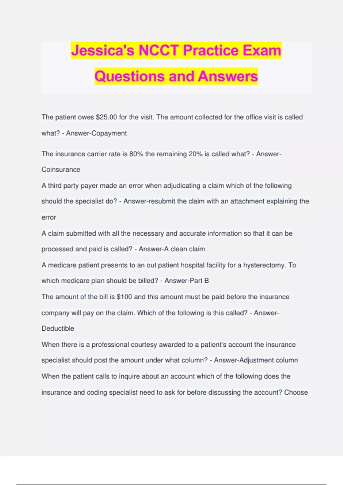 Jessica's NCCT Practice Exam Questions and Answers The patient owes $25.00 for the visit. The amount collected for the office visit is called what? - Answer-Copayment The insurance carrier rate is 80% the remaining 20% is called what? - Answer- Coinsurance A third party payer made an error when adjudicating a claim which of the following should the specialist do? - Answer-resubmit the claim with an attachment explaining the error A claim submitted with all the necessary and accurate information so that it can be processed and paid is called? - Answer-A clean claim A medicare patient presents to an out patient hospital facility for a hysterectomy. To which medicare plan should be billed? - Answer-Part B The amount of the bill is $100 and this amount must be paid before the insurance company will pay on the claim. Which of the following is this called? - Answer- Deductible When there is a professional courtesy awarded to a patient's account the insurance specialist should post the amount under what column? - Answer-Adjustment column When the patient calls to inquire about an account which of the following does the insurance and coding specialist need to ask for before discussing the account? Choose 3 correct answers. - Answer-patient's insurance Id number, patient's date of birth, patient's name When a capitation account is applied to a ledger it is also know as what? - Answer- Monthly Prepayment amount The insurance and coding specialist calls a carrier to verify a patient's insurance an the representative states that the patient's insurance was cancelled three months ago. Which of the following should the insurance specialist do first? - Answer-Ask the patient for another form of insurance coverage Which are the following are necessary to complete a CMS-1500 form (Choose 3) correct answers. - Answer-Diagnosis CPT and ICD-10 codes, Physician information, Demographic information Which of the following reports is used to follow up on an outstanding claims to third party payers? - Answer-Aging When following upon a denied claim an insurance specialist should have which of the following information available when speaking with the insurance company? Select 3 correct answers. - Answer-Patient's insurance ID number, Physician's NPI number, and Date of service Developing an insurance claim begins when? - Answer-When the patient calls to schedule an appointment Which of the following must be verified to process a credit card transaction? Choose (3) correct answers. - Answer-Security code, credit card number, and account number The most effective method to manage statements and other financial invoices as well as avoid payment delays is to do what? - Answer-Collect fees at the time of service Based on the CMS 1500 manual system, when updating or maintaining the billing code database which of the following does the R denote? - Answer-Revised An insurance and coding specialist is reviewing a patient's encounter form that is documented in the medical record prior to completing a CMS-1500 form she notices the physician up-coded the encounter form. The specialist has an ethical obligation to first? - Answer-Query the physician HIPPA allows a healthcare provider to communicate with a patient's family, friend, or other person's who are involved in the patient's care regarding their mental health status providing the patient does what? - Answer-Does not object Claims are often rejected because a provider needs to obtain what? - Answer- Preauthourizations When using an Electronic Health Record (EHR) system to enter cpt codes on a CMS- 1500 claim form for electronic submission which of the following should be entered on the claim form first? - Answer-The most resource-intensive procedure or service The Fair and Debt collection Act restricts debt collectors from engaging in conduct that includes what? - Answer-Calling before 8:00am or after 9:00pm, unless given permission Which of the following information is needed to determine a Medicaid sliding fee scale? choose (3) correct answers - Answer-Poverty, salary, and number of depedents The patient presents today for upper gastroinstestinal (GI) endoscopy and a biopsy of the stomach. Which of the cpt codes should be assigned? - Answer-43239 Digestive Esophagogastroduodenoscopy with biopsy