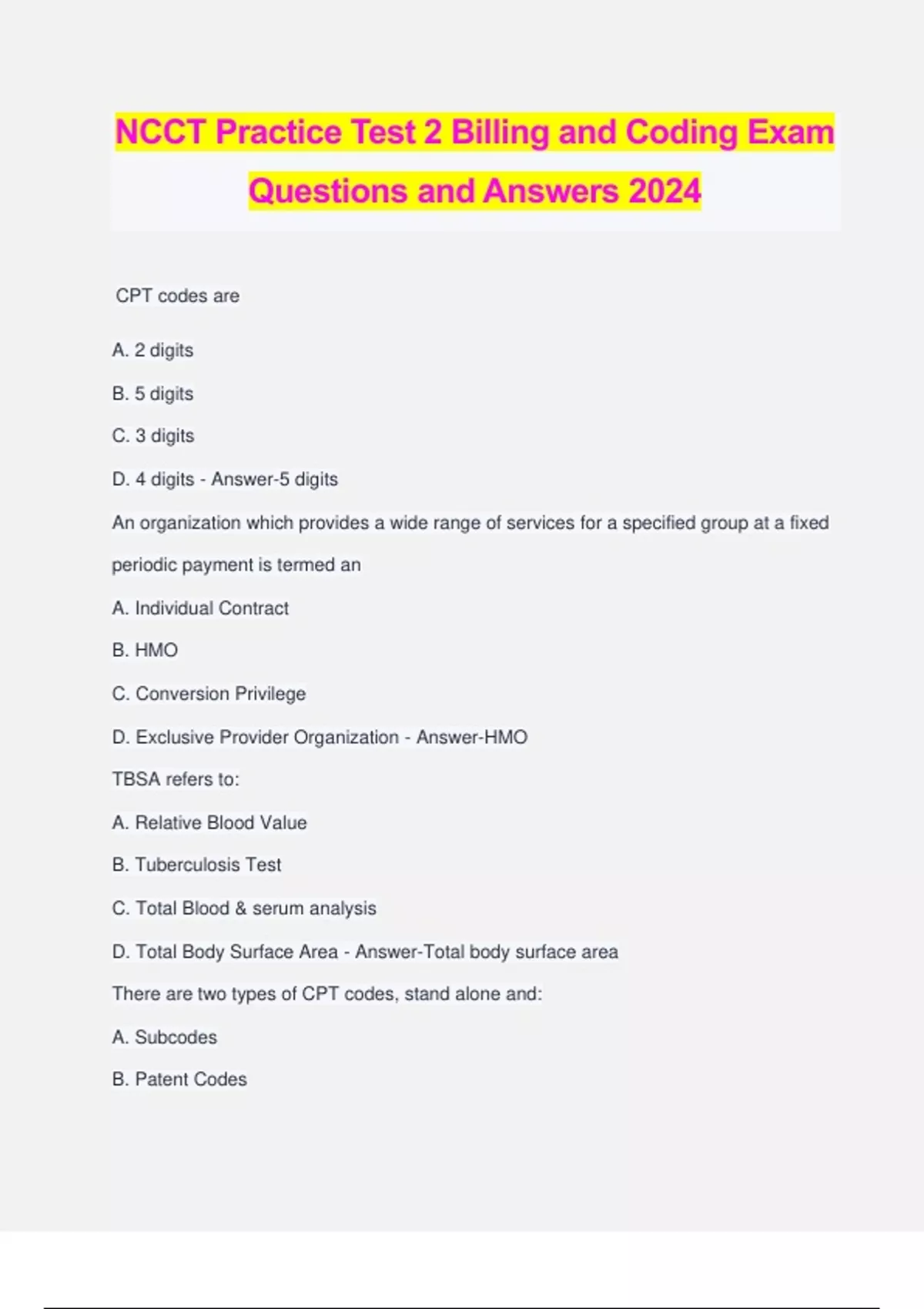 NCCT Practice Test 2 Billing and Coding Exam Questions and Answers 2024 CPT codes are A. 2 digits B. 5 digits C. 3 digits D. 4 digits - Answer-5 digits An organization which provides a wide range of services for a specified group at a fixed periodic payment is termed an A. Individual Contract B. HMO C. Conversion Privilege D. Exclusive Provider Organization - Answer-HMO TBSA refers to: A. Relative Blood Value B. Tuberculosis Test C. Total Blood & serum analysis D. Total Body Surface Area - Answer-Total body surface area There are two types of CPT codes, stand alone and: A. Subcodes B. Patent Codes C. Stand Aside Codes D. Indented Codes - Answer-Indented Codes Services in which opinions of specialists are requested, are called: A. Lectures B. Consultations C. Ancillary Services D. Office Visits - Answer-Consultations Examples of HCPCS Level II codes are: A. Specified Types of Physicians B. Emergency Case C. Inpatient Procedures D. Supplies, orthotics, prosthetics, DME, equipment, and ambulance services - Answer- Supplies, orthotics, prosthetics, DME, equipment, and ambulance services Everything that you see, hear, or read about a patients condition must remain: A. Accurate B. Confidential C. Historical D. Inclusive - Answer-Confidential Because of the new Medicare regulations insurance companies are predominantly using what type of claims? A. Encounter B. Electronic C. Paper D. Daily - Answer-Electronic A "combining form" meaning joint is: A. Ankyl/o B. Cost/o C. Arthro/o D. Spondyl/o - Answer-Arthro/o If an error is made in a patients chart, what should be done before adding the correct information nearby? A. White out the error B. Scratch out the error C. Draw a single line through the error D. Erase the error - Answer-Draw a single line through the error When sequencing codes for multiple burns, list: A. Third degree First B. The largest Burn first C. Burns on the face and neck first D. In the order of first, second & third degree - Answer-Third degree first Another name for a release of information form is a: A. Assignment of benefits B. Requisition C. Consent D. Encounter - Answer-Consent Which of the following is not a type of wound? A. Excision B. Laceration C. Puncture D. Avulsion - Answer-Excision The opposite of ventral is: A. Cervical B. Dorsal C. Lumbar D. Posterior - Answer-Dorsal In a Medicare billing dispute, the amount of controversy must be at least: A. $100 B. $200 C. $500 D. $1000 - Answer-$100 A suffix indicating the surgical creation of an opening is: A. Ectomy B. Otomy C. Ostomy D. Plasty - Answer-Ostomy The usual abbreviation for complete blood count is: A. CBC B. HCT C. GGT D. RBC - Answer-CBC Which of the following abbreviations might charted if a patient has a bladder infection: A. BI B. BI, bacterial C. UTI D. UCT, bacterial - Answer-UTI All of the following are included in the Medicare EPSDT program for welfare children except: A. Treatment for mental defects B. Development assessment C. Remedial education D. Dental screening - Answer-Remedial Education Intentional misrepresentation of facts in order to deceive or mislead others is: A. Fraud B. Libel C. Abuse D. Embezzlement - Answer-Fraud Self-Employed insurance billing specialists can deduct all but which one of the following expenses from income taxes: A. Business Travel Expenses B. Subscriptions to professional magazines C. Theatre Tickets D. Depreciation of office equipment - Answer-Theatre Tickets The medical term for high blood pressure: A. Hypertensive heart disease B. Arteriosclerosis C. Hypertension D. Hypotension - Answer-Hypertension An individual who promises to pay the medical bill by signing an agreement to pay form is the: A. Medicare Representative B. Arbitrator C. Mediator D. Guarantor - Answer-Guarantor A report mentioning such words as cranium, maxilla, and mandible would be referring to: A. Hip B. Head C. Pelvic Girdle D. Spine - Answer-Head The following subsections of Evaluation and Management services except: A. Emergency Department Services B. Office of other outpatient services C. Consultations D. Concurrent Care - Answer-Concurrent Care In the Medicare program a clean claim means that: A. The claim has no deficiencies B. The carrier doesn't need to investigate further C. The claim passes all electronic edits D. All answers are correct - Answer-D. The claim has no deficiencies, does not further investigation, and that it passes all electronic edits HCT is the medical abbreviation for: A. High frequency computerized tomography B. Hematocrit C. Hemoglobin D. Human chrorionic ganodatropin - Answer-Hematocrit The subsequent injury fund was established for problems that arise when a: A. Previously injured person is injured at work again B. Rehabilitated person returns to work C. Military person returns to work D. Claim is filed later than the time limit - Answer-Previously injured person is injured at work again Tricare offers 3 types of plans: A. Champus, Champus Plus , & CHampus Extra B. Standard, Extra & Prime