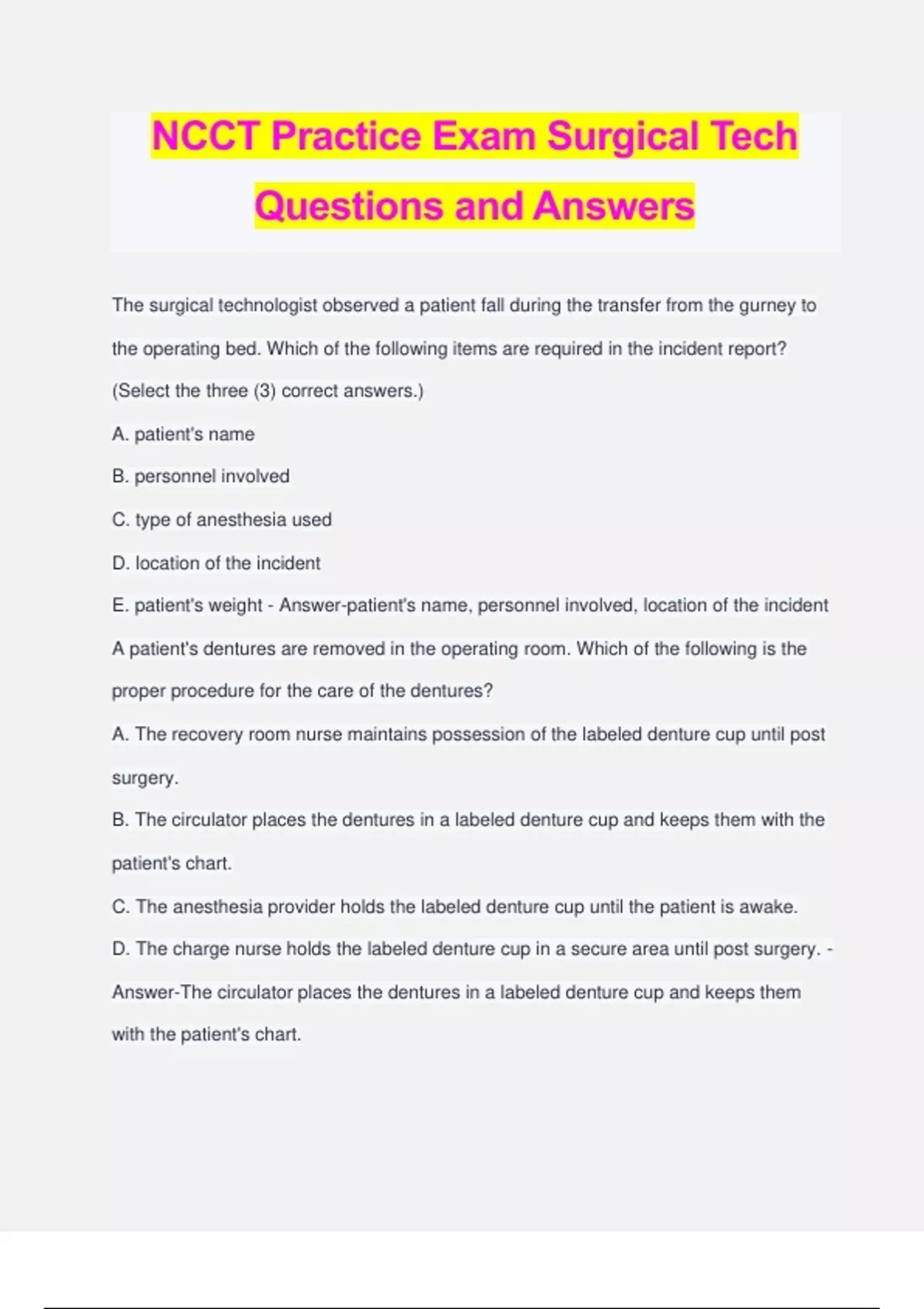 NCCT Practice Exam Surgical Tech Questions and Answers The surgical technologist observed a patient fall during the transfer from the gurney to the operating bed. Which of the following items are required in the incident report? (Select the three (3) correct answers.) A. patient's name B. personnel involved C. type of anesthesia used D. location of the incident E. patient's weight - Answer-patient's name, personnel involved, location of the incident A patient's dentures are removed in the operating room. Which of the following is the proper procedure for the care of the dentures? A. The recovery room nurse maintains possession of the labeled denture cup until post surgery. B. The circulator places the dentures in a labeled denture cup and keeps them with the patient's chart. C. The anesthesia provider holds the labeled denture cup until the patient is awake. D. The charge nurse holds the labeled denture cup in a secure area until post surgery. - Answer-The circulator places the dentures in a labeled denture cup and keeps them with the patient's chart. The surgeon begins to close the uterus during a myomectomy. Which of the following actions should the surgical technologist take before continuing with the closure of the wound? A. Initiate the closing count. B. Initiate the cavity count. C. Obtain sterile wound dressing material. D. Weigh the myoma. - Answer-Initiate the cavity count. The surgical technologist prepared a breast lump to send as a frozen section to pathology. The surgical technologist should pass off the specimen placed A. in normal saline. B. on a raytec sponge. C. on a telfa pad. D. in formalin. - Answer-on a telfa pad. Which of the following steps are taken after the surgery has finished and the surgical technologist is breaking scrub? A. Wipe blood off of gloves and remove them, then remove the gown. B. Using a gloved hand, untie the neck of the gown and pull away from the body, keeping all blood on the gown. C. Wipe the gloves off, grasp the gown at the shoulders, and roll the gown forward into a ball. D. Ask the circulator to assist in removing the gown and gloves. - Answer-Wipe the gloves off, grasp the gown at the shoulders, and roll the gown forward into a ball. The patient coming into surgery is from northern India. After induction the anesthesia provider asks for hair clippers to trim the patients beard to tape the endotracheal tube in place. Which of the following is the appropriate action? A. Retrieve the clippers as this is medically necessary regardless of religion. B. Inform the anesthesia provider of the patient's religion. C. Consult with the surgeon as this was not on the consent. D. Provide a razor as a better option than the hair clipper. - Answer-Inform the anesthesia provider of the patient's religion. The surgical technologist is helping the surgeon complete a laparoscopic cholecystectomy and the surgeon has placed the dressing on the patient. Which of the following should the surgical technologist do next? A. Remove the top glove, hold the dressing in place, roll away the drape and discard. B. Remove Mayo stand, back table and top glove, hold the dressing in place, tear the drape off the patient and discard. C. Remove top glove, hold dressing in place, tear the drape off patient and discard. D. Remove the Mayo stand, back table and top glove, hold the dressing in place, roll away the drape and discard. - Answer-Remove the Mayo stand, back table and top glove, hold the dressing in place, roll away the drape and discard. During a small bowel resection the surgeon intends to use a disposable internal stapling device. When should the device be assembled by the surgical technologist? A. before the case starts B. after the surgeon choses the device C. after the case is set up D. once the patient is draped - Answer-after the surgeon choses the device When breaking down the setup, which of the following steps should be completed first? A. The instruments are put back into the instrument tray and placed in/on the case cart. B. All sharps are contained and disposed of in the sharps container. C. Spray down the non-disposable instruments with cleaner. D. All disposable drapes are discarded into the trash receptacle - Answer-All sharps are contained and disposed of in the sharps container. A 21-year-old patient is rushed to the OR with a self-inflicted stab wound to the groin. The wound is an inch in length and the patient has flat lined with a steady flow of blood pumping from the small wound. Which of the following items should the surgical technologist have ready for the surgeon? (Select the three (3) correct answers.) A. Yankauer suction B. lap sponges C. Raytec sponges D. Frazier suction E. knife blade - Answer-lap sponges, knife blade, Yankauer suction A tornado warning is in effect and power has been switched to the generator due to downed electrical lines. The hospital's disaster triage protocol has been activated. A surgical procedure is in progress. Which of the following is the best course of action to ensure patient safety? A. Immediately evacuate the patient to the preoperative holding area. B. Finish the procedure and evacuate the patient. C. Place wet towels under door and finish the procedure. D. Cover the back table until the storm passes. - Answer-Finish the procedure and evacuate the patient. During an otorhinolaryngologic procedure, which of the following precautions should the surgical technologist take if the anesthesia provider is using an uncuffed endotracheal tube? A. Fill the endotracheal tube with sterile water and saline to reduce leakage of oxygen. B. Fill the endotracheal tube with sterile saline and methylene blue to check for leakage of oxygen. C. Moisten the head drape around the field prior to start of procedure to minimize leakage and reduce heat buildup. D. Moisten sponges and place around the field prior to start of procedure to minimize leakage and reduce heat buildup. - Answer-Moisten sponges and place around the field prio