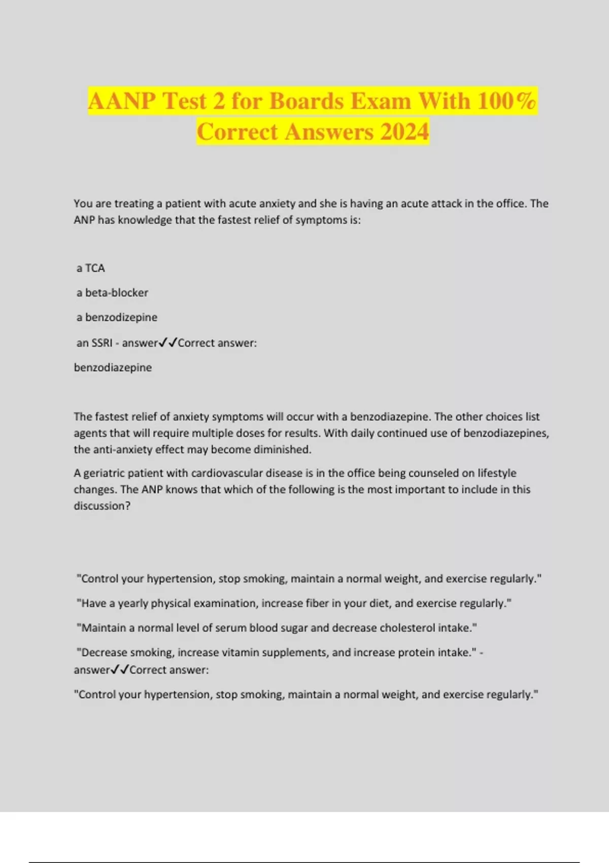 AANP Test 2 for Boards Exam With 100% Correct Answers 2024 You are treating a patient with acute anxiety and she is having an acute attack in the office. The ANP has knowledge that the fastest relief of symptoms is: a TCA a beta-blocker a benzodizepine an SSRI - answerCorrect answer: benzodiazepine The fastest relief of anxiety symptoms will occur with a benzodiazepine. The other choices list agents that will require multiple doses for results. With daily continued use of benzodiazepines, the anti-anxiety effect may become diminished. A geriatric patient with cardiovascular disease is in the office being counseled on lifestyle changes. The ANP knows that which of the following is the most important to include in this discussion? "Control your hypertension, stop smoking, maintain a normal weight, and exercise regularly." "Have a yearly physical examination, increase fiber in your diet, and exercise regularly." "Maintain a normal level of serum blood sugar and decrease cholesterol intake." "Decrease smoking, increase vitamin supplements, and increase protein intake." - answerCorrect answer: "Control your hypertension, stop smoking, maintain a normal weight, and exercise regularly." All of these are important for the geriatric patient to decrease cardiovascular risk. Controlling hyperglycemia, high fiber intake, and vitamins all assist in maintaining a healthy lifestyle but do not help to prevent cardiovascular disease. You are seeing a female with inflammatory bowel disease, known as IBD. The Adult Nurse Practitioner knows that if she orders a hemogram on this patient, which of the following results would be seen if the patient was anemic? microcytic, hypochromic type macrocytic, normochromic type normocytic, normochromic type macrocytic, hypochromic type - answerCorrect Answer: normocytic, normochromic type Anemia is a common problem in IBD. The etiology is often from multiple causes. The anemia of chronic disease, a normocytic, normochromic anemia, is a result of inflammation of the IBD without blood loss. Blood loss would result in a microcytic, hypochromic anemia. The macrocytic anemias are a result of deficiency in vitamin B12 or other causes. Which of the following is the least likely risk factor for suicide? physical illness male increasing age black race - answerCorrect answer: black race Being of a white race is more likely to be a factor in suicide. Besides the other three choices risk factors include: substance abuse, living alone, and less education. The healthcare provider's required level of expected conduct as established by custom, law, or professional organizations is called the: Standard of care. Breach of duty. Duty. Malpractice. - answerCorrect answer: Standard of care Standard of care is another term associated with negligence. Standard of care is a healthcare provider's required level of expected conduct as established by custom, law, or professional organizations. A brief account by the patient of any signs or symptoms he or she is experiencing is one component of: Review of systems. Symptom assessment. Functional assessment. Objective assessment. - answerCorrect Answer: Review of systems In the review of systems, the patient tells the nurse in his or her own words what signs or symptoms he or she has experienced in various body systems. It is important that these be in a patient's own words to perform the most complete and accurate assessment. All of the following are typical changes to the gastrointestinal system that come with aging EXCEPT: decreased liver size decreased muscle tone in bowel increased absorption of calcium atrophy of salivary glands - answerCorrect answer: increased absorption of calciu