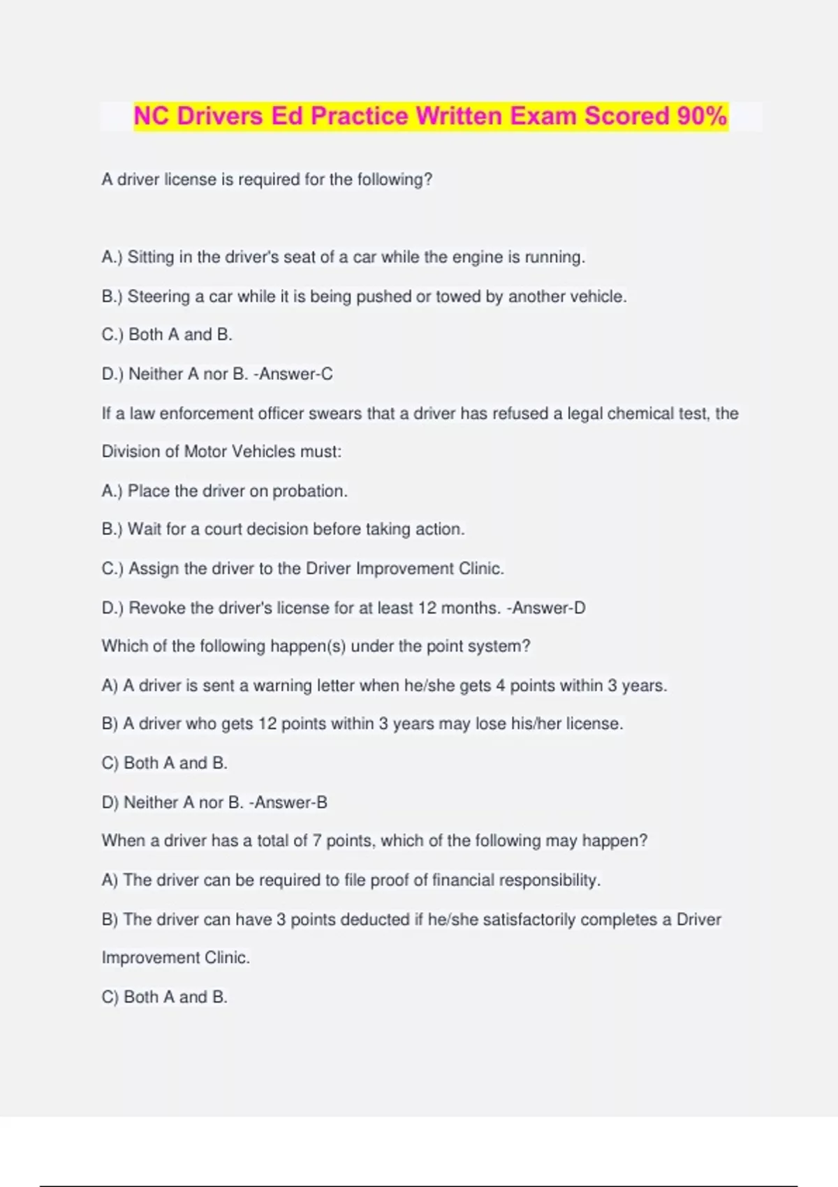 NC Drivers Ed Practice Written Exam Scored 90% A driver license is required for the following? A.) Sitting in the driver's seat of a car while the engine is running. B.) Steering a car while it is being pushed or towed by another vehicle. C.) Both A and B. D.) Neither A nor B. -Answer-C If a law enforcement officer swears that a driver has refused a legal chemical test, the Division of Motor Vehicles must: A.) Place the driver on probation. B.) Wait for a court decision before taking action. C.) Assign the driver to the Driver Improvement Clinic. D.) Revoke the driver's license for at least 12 months. -Answer-D Which of the following happen(s) under the point system? A) A driver is sent a warning letter when he/she gets 4 points within 3 years. B) A driver who gets 12 points within 3 years may lose his/her license. C) Both A and B. D) Neither A nor B. -Answer-B When a driver has a total of 7 points, which of the following may happen? A) The driver can be required to file proof of financial responsibility. B) The driver can have 3 points deducted if he/she satisfactorily completes a Driver Improvement Clinic. C) Both A and B. D) Neither A nor B. -Answer-B 5. Conviction for which of the following carries the highest number of points? A. Reckless driving. B. Hit and run with property damage. C. Driving without a license. D. Passing a stopped school bus unloading children. -Answer-D A driver will lose his/her license if he/she is convicted of: A) Driving without a license. B) Passing a stopped school bus. C) Failing to yield the right-of-way. D) Speeding more than 75 mph in a 55mph zone. -Answer-D To get a revoked driver license restored, a person must do which of the following? A) Obtain permission from the Driver License Section in Raleigh to reapply for a license. B) Go to a driver license office, pay a restoration fee, and reapply for a license. C) Both A and B. D) Neither A nor B. -Answer-C Roughly half of all traffic fatalities involve which of the following? A) A drunken person. B) More than 1 car. C) Both A and B. D) Neither A nor B. -Answer-A The percentage of highway deaths caused by drunken persons is about: A) 10% B) 25% C) 50% D) 67% -Answer-C Which of the following statements about pedestrian deaths is correct? A) In cities, 2 out of 5 people killed in motor vehicle accidents are pedestrians. B) Most of the pedestrians killed in all traffic accidents are teenagers. C) Both A and B. D) Neither A nor B. -Answer-A When you are walking at night along a road without sidewalks, you should do which of the following? A) Walk on the left, facing traffic. B) Keep your back to oncoming traffic. C) Both A and B. D) Neither A nor B. -Answer-A If you approach an intersection where there are no traffic lights/signs and a pedestrian is attempting to cross your path, who has the right-of-way? A) The pedestrian. B) The driver of the car. C) No one. D) Whoever reaches the intersection first. -Answer-A If you are walking along a road at night, what should you do? A) Walk on the right-hand side with the traffic. B) Wear or carry something white. C) Both A and B. D) Neither A nor B. -Answer-B A safe driver does which of the following? A) Watches the side of the road over the hood to stay in line. B)Frequently checks the rear-view and side mirrors. C) Drinks coffee while driving at night to stay alert. D) Keeps 2 car lengths between his/her car and the next car on the expressway. - Answer-B As you approach an intersection to make a right turn, you should turn on your right turn signal and do which of the following? A) Steer slightly toward the center of the road to give yourself room to clear the corner. B) Hold your arm straight out the window. C) Both A and B. D) Neither A nor B. -Answer-D If you begin to feel sleepy while driving on a long trip, you should do which of the following? A) Open a window or vent to let in fresh air. B) Increase your speed. C) Both A and B. D) Neither A nor B. -Answer-A When driving on a long trip, you should: A) Rest your eyes from time to time by rubbing them. B) Avoid looking at any one thing for more than a few seconds. C) Keep your eyes on the center of the road straight ahead. D) Spend as much time looking in your mirrors as you do looking in front of you. - Answer-B In order to avoid being hit in the rear by another vehicle, you should do which of the following? A) Drive cautiously and use your brakes often. B) Check your rear-view mirrors often. C) Both A and B. D) Neither A nor B. -Answer-B Studies have shown which of the following to be a serious traffic hazard? A) Middle-aged drivers. B) Slow drivers. C) Both A and B. D) Neither A nor B. -Answer-B Very slow driving is especially dangerous in which of the following situations? A) Just after passing the crest of a hill. B) Just after rounding a curve. C) Both A and B. D) Neither A nor B. -Answer-C