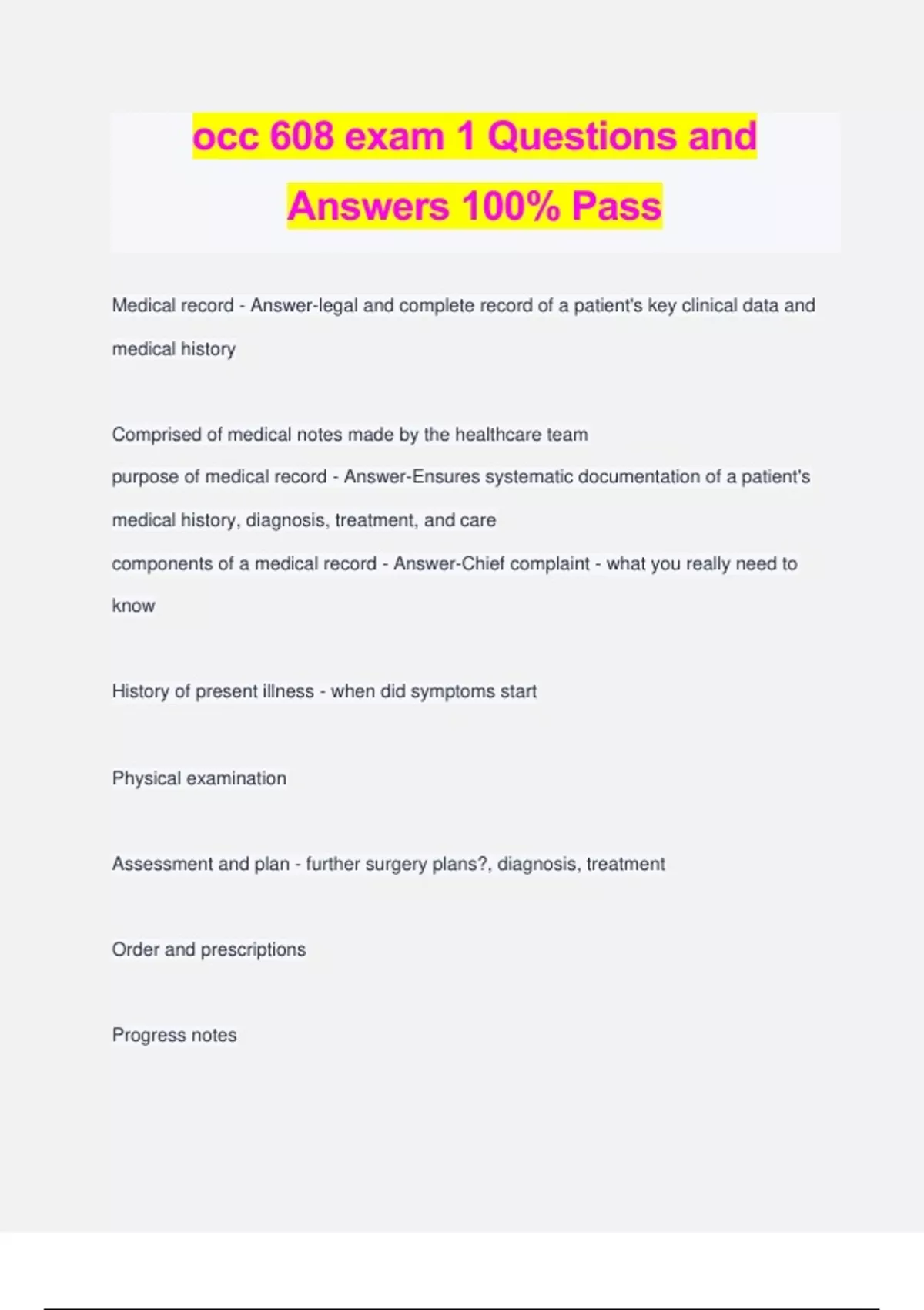 occ 608 exam 1 Questions and Answers 100% Pass Medical record - Answer-legal and complete record of a patient's key clinical data and medical history Comprised of medical notes made by the healthcare team purpose of medical record - Answer-Ensures systematic documentation of a patient's medical history, diagnosis, treatment, and care components of a medical record - Answer-Chief complaint - what you really need to know History of present illness - when did symptoms start Physical examination Assessment and plan - further surgery plans?, diagnosis, treatment Order and prescriptions Progress notes Test results what to look for in a medical record for OT - Answer-pain levels vital signs lab values meds MD orders restrictions/precautions special learning needs other notes payer source discharge plan electronic health record education model - Answer-Basic computer literacy skills Health information literacy skills Clinical informatics skills EHR privacy and confidentiality skills Electronic data security skills EHR patient-centered communication skills domains of ot - Answer-Occupations Client Factors Performance Skills Performance Patterns Contexts occupations - Answer-adls iadls health management rest and sleep education work play leisure social participation contexts - Answer-environment factors personal factors performance patterns - Answer-habits routines roles rituals performance skills - Answer-observable, goal-directed actions motor skills process skills social interaction skills motor skills - Answer-moving oneself or moving and interacting with tangible task objects common terms: stabilizes, positions, reaches, manipulates, coordinates, transports, endures, paces process skills - Answer-selecting, interacting with, and using tangible task objects carrying out individual actions and steps preventing problems of occupational performance from occurring/reoccurring common terms: paces, attends, chooses, inquires, initiates, terminates, searches, organizes, notices, accommodates social interaction skills - Answer-communicating and interacting with others in the context of engaging in a personally and ecologically relevant daily life task performance that involves social interaction with others common terms: initiates, terminates, produces, physically supports, maintains flow, verbally supports, adapts *all terms in context of social interaction client factors - Answer-values, beliefs, spirituality, body functions, body structures body functions - Answer-physiological functions of body systems i.e. mental, sensory, cardiovascular, neuromuscular functions body structures - Answer-anatomical parts of the body such as organs, limbs, and their components purpose of an occupational profile - Answer-Summary of client's (persons, groups, populations) occupational history and experiences, patterns of daily living, interests, values, needs and relevant contexts components of occupational profile - Answer-why client is seeking services successes and barriers with occupatio