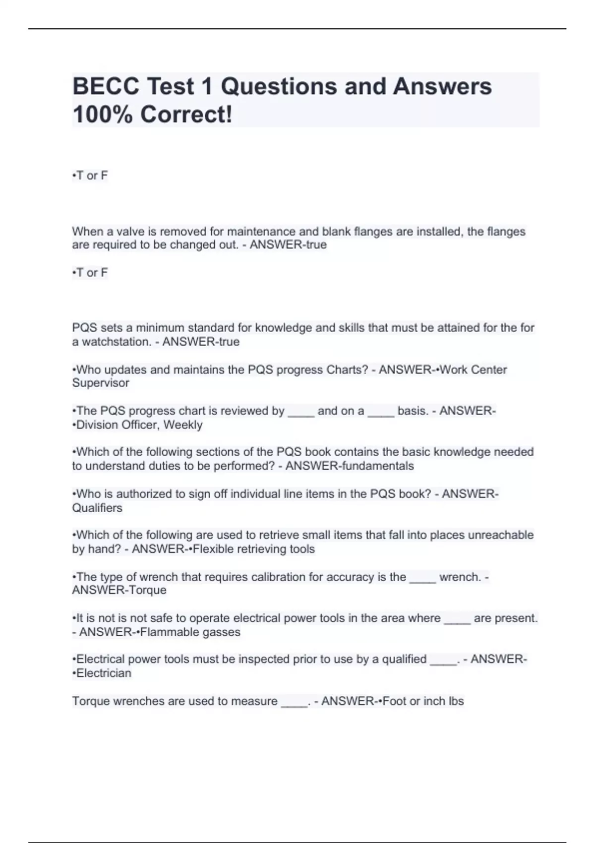 •T or F When a valve is removed for maintenance and blank flanges are installed, the flanges are required to be changed out. - ANSWER-true •T or F PQS sets a minimum standard for knowledge and skills that must be attained for the for a watchstation. - ANSWER-true •Who updates and maintains the PQS progress Charts? - ANSWER-•Work Center Supervisor •The PQS progress chart is reviewed by ____ and on a ____ basis. - ANSWER-•Division Officer, Weekly •Which of the following sections of the PQS book contains the basic knowledge needed to understand duties to be performed? - ANSWER-fundamentals •Who is authorized to sign off individual line items in the PQS book? - ANSWER-Qualifiers •Which of the following are used to retrieve small items that fall into places unreachable by hand? - ANSWER-•Flexible retrieving tools •The type of wrench that requires calibration for accuracy is the ____ wrench. - ANSWER-Torque •It is not is not safe to operate electrical power tools in the area where ____ are present. - ANSWER-•Flammable gasses •Electrical power tools must be inspected prior to use by a qualified ____. - ANSWER-•Electrician Torque wrenches are used to measure ____. - ANSWER-•Foot or inch lbs •T or F Torque wrench has to be tested and calibrated for accuracy? - ANSWER-•True •The time required to complete all maintenance listed listed on the EGL should not exceed ____ hours. - ANSWER-8 •T or F
