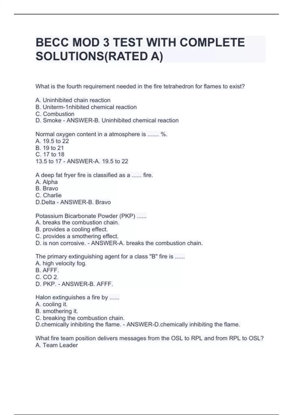What is the fourth requirement needed in the fire tetrahedron for flames to exist? A. Uninhibited chain reaction B. Uniterm-1nhibited chemical reaction C. Combustion D. Smoke - ANSWER-B. Uninhibited chemical reaction Normal oxygen content in a atmosphere is ....... %. A. 19.5 to 22 B. 19 to 21 C. 17 to 18 13.5 to 17 - ANSWER-A. 19.5 to 22 A deep fat fryer fire is classified as a ...... fire. A. Alpha B. Bravo C. Charlie D.Delta - ANSWER-B. Bravo Potassium Bicarbonate Powder (PKP) ...... A. breaks the combustion chain. B. provides a cooling effect. C. provides a smothering effect. D. is non corrosive. - ANSWER-A. breaks the combustion chain. The primary extinguishing agent for a class "B" fire is ...... A. high velocity fog. B. AFFF. C. CO 2. D. PKP. - ANSWER-B. AFFF. Halon extinguishes a fire by ...... A. cooling it. B. smothering it. C. breaking the combustion chain. D.chemically inhibiting the flame. - ANSWER-D.chemically inhibiting the flame. What fire team position delivers messages from the OSL to RPL and from RPL to OSL? A. Team Leader B. Messenger C. Investigator D. Nozzleman - ANSWER-B. Messenger Which person is part of the rapid response team? A. Plugman B. Messenger C. Fire marshal D. OSL - ANSWER-C. Fire marshal