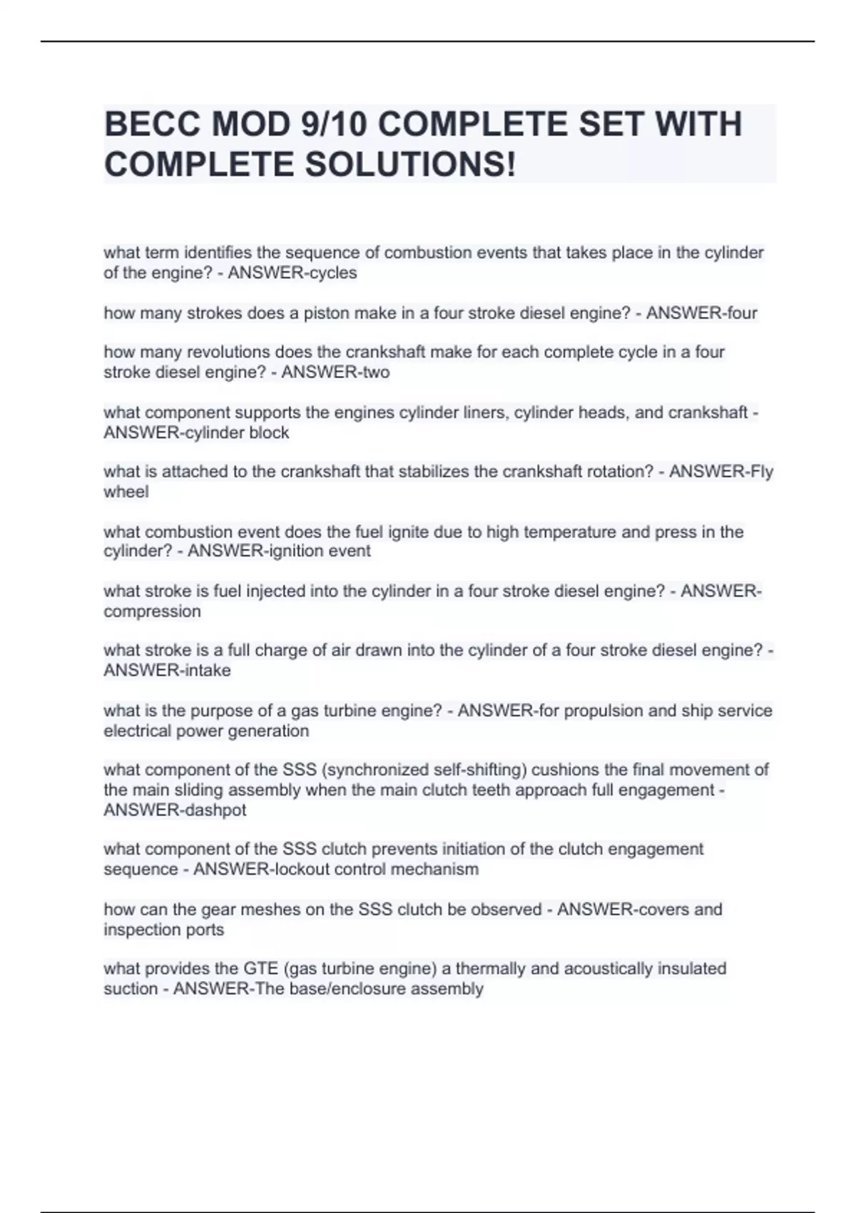 what term identifies the sequence of combustion events that takes place in the cylinder of the engine? - ANSWER-cycles how many strokes does a piston make in a four stroke diesel engine? - ANSWER-four how many revolutions does the crankshaft make for each complete cycle in a four stroke diesel engine? - ANSWER-two what component supports the engines cylinder liners, cylinder heads, and crankshaft - ANSWER-cylinder block what is attached to the crankshaft that stabilizes the crankshaft rotation? - ANSWER-Fly wheel what combustion event does the fuel ignite due to high temperature and press in the cylinder? - ANSWER-ignition event what stroke is fuel injected into the cylinder in a four stroke diesel engine? - ANSWER-compression what stroke is a full charge of air drawn into the cylinder of a four stroke diesel engine? - ANSWER-intake what is the purpose of a gas turbine engine? - ANSWER-for propulsion and ship service electrical power generation what component of the SSS (synchronized self-shifting) cushions the final movement of the main sliding assembly when the main clutch teeth approach full engagement - ANSWER-dashpot what component of the SSS clutch prevents initiation of the clutch engagement sequence - ANSWER-lockout control mechanism how can the gear meshes on the SSS clutch be observed - ANSWER-covers and inspection ports what provides the GTE (gas turbine engine) a thermally and acoustically insulated suction - ANSWER-The base/enclosure assembly how many compressor stages are on the GTE compressor - ANSWER-16