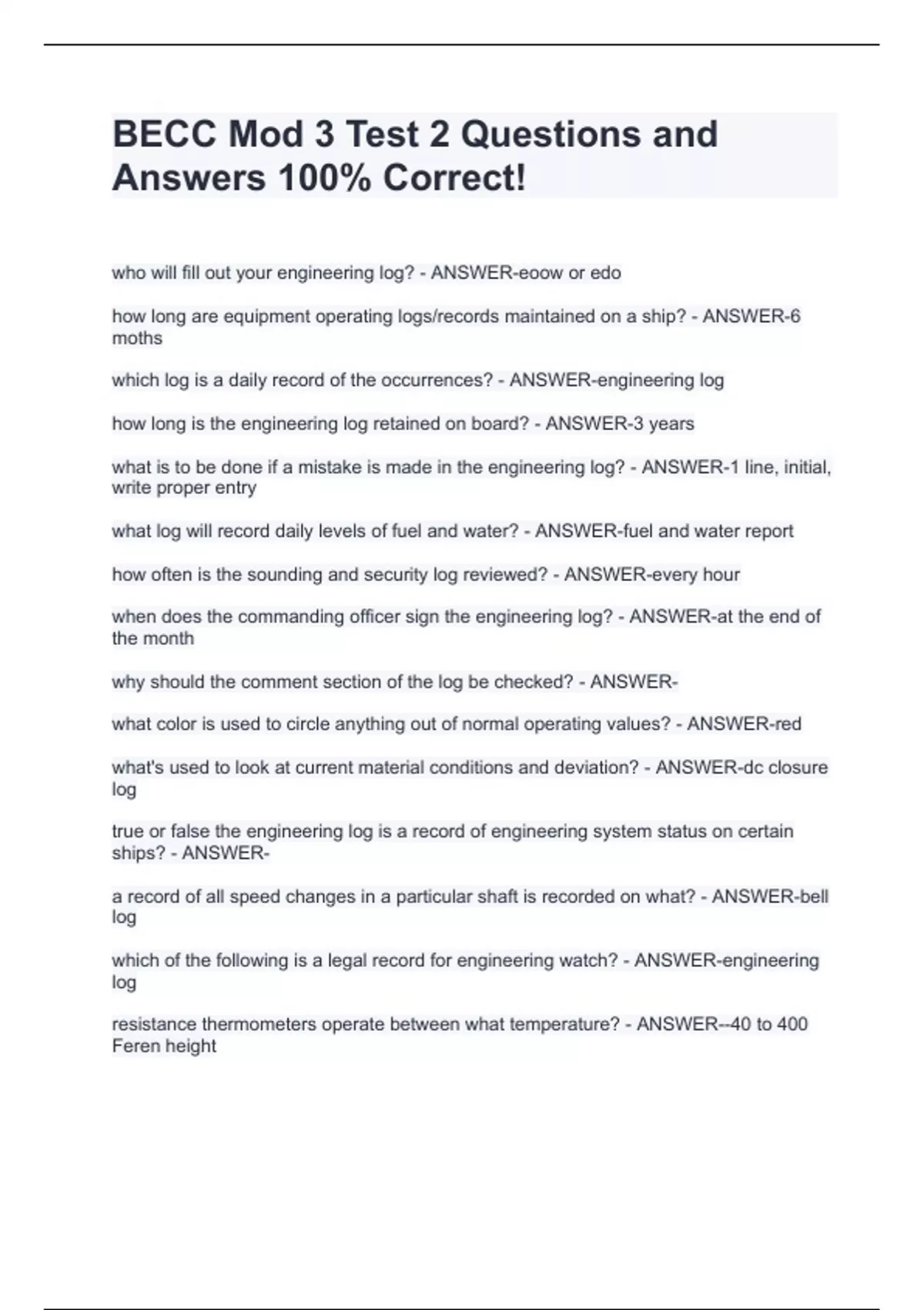who will fill out your engineering log? - ANSWER-eoow or edo how long are equipment operating logs/records maintained on a ship? - ANSWER-6 moths which log is a daily record of the occurrences? - ANSWER-engineering log how long is the engineering log retained on board? - ANSWER-3 years what is to be done if a mistake is made in the engineering log? - ANSWER-1 line, initial, write proper entry what log will record daily levels of fuel and water? - ANSWER-fuel and water report how often is the sounding and security log reviewed? - ANSWER-every hour when does the commanding officer sign the engineering log? - ANSWER-at the end of the month why should the comment section of the log be checked? - ANSWER- what color is used to circle anything out of normal operating values? - ANSWER-red what's used to look at current material conditions and deviation? - ANSWER-dc closure log true or false the engineering log is a record of engineering system status on certain ships? - ANSWER- a record of all speed changes in a particular shaft is recorded on what? - ANSWER-bell log
