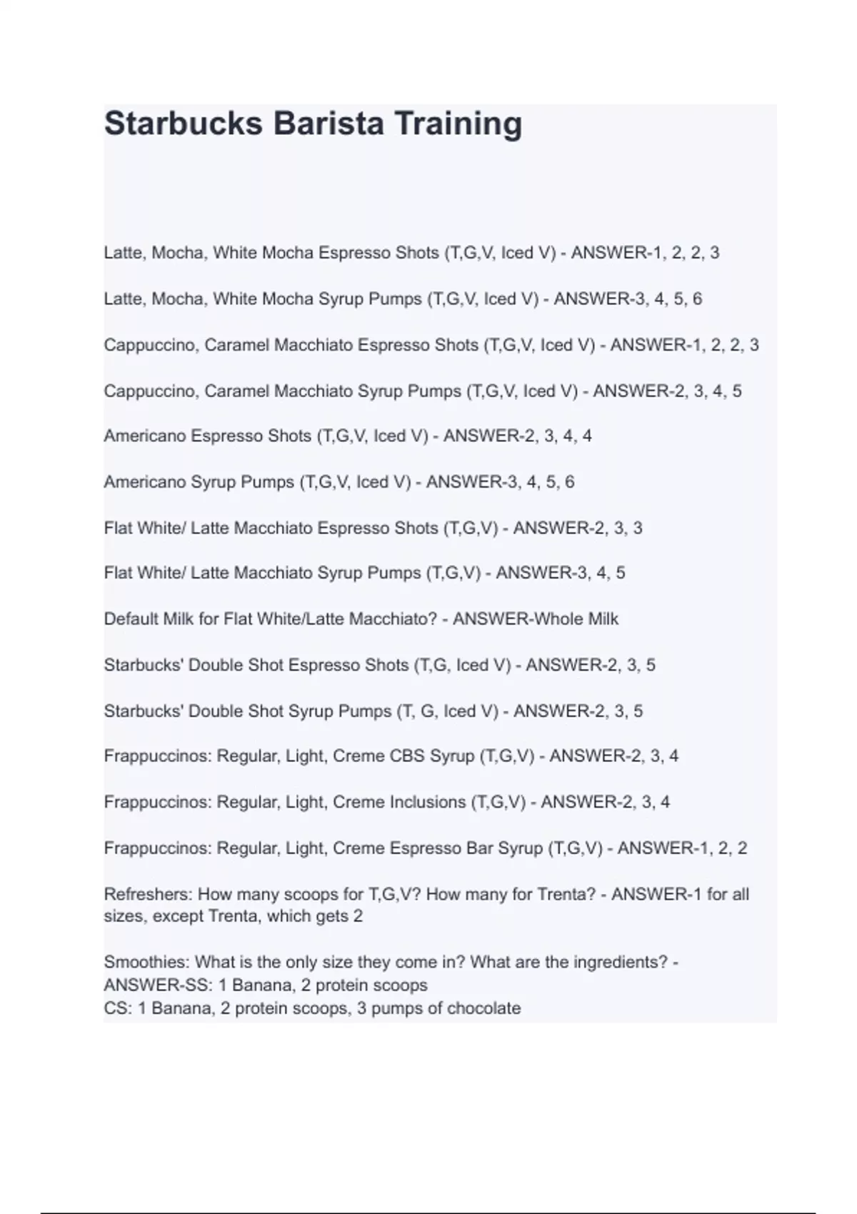 Latte, Mocha, White Mocha Espresso Shots (T,G,V, Iced V) - ANSWER-1, 2, 2, 3 Latte, Mocha, White Mocha Syrup Pumps (T,G,V, Iced V) - ANSWER-3, 4, 5, 6 Cappuccino, Caramel Macchiato Espresso Shots (T,G,V, Iced V) - ANSWER-1, 2, 2, 3 Cappuccino, Caramel Macchiato Syrup Pumps (T,G,V, Iced V) - ANSWER-2, 3, 4, 5 Americano Espresso Shots (T,G,V, Iced V) - ANSWER-2, 3, 4, 4 Americano Syrup Pumps (T,G,V, Iced V) - ANSWER-3, 4, 5, 6 Flat White/ Latte Macchiato Espresso Shots (T,G,V) - ANSWER-2, 3, 3 Flat White/ Latte Macchiato Syrup Pumps (T,G,V) - ANSWER-3, 4, 5 Default Milk for Flat White/Latte Macchiato? - ANSWER-Whole Milk Starbucks' Double Shot Espresso Shots (T,G, Iced V) - ANSWER-2, 3, 5 Starbucks' Double Shot Syrup Pumps (T, G, Iced V) - ANSWER-2, 3, 5 Frappuccinos: Regular, Light, Creme CBS Syrup (T,G,V) - ANSWER-2, 3, 4 Frappuccinos: Regular, Light, Creme Inclusions (T,G,V) - ANSWER-2, 3, 4 Frappuccinos: Regular, Light, Creme Espresso Bar Syrup (T,G,V) - ANSWER-1, 2, 2 Refreshers: How many scoops for T,G,V? How many for Trenta? - ANSWER-1 for all sizes, except Trenta, which gets 2 Smoothies: What is the only size the