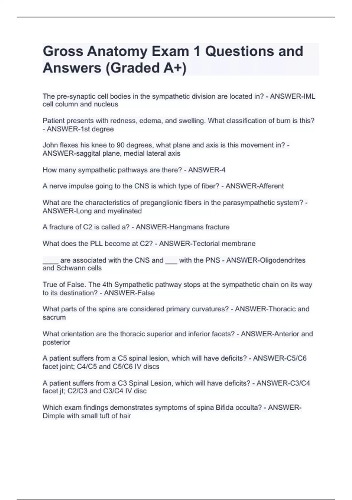 The pre-synaptic cell bodies in the sympathetic division are located in? - ANSWER-IML cell column and nucleus Patient presents with redness, edema, and swelling. What classification of burn is this? - ANSWER-1st degree John flexes his knee to 90 degrees, what plane and axis is this movement in? - ANSWER-saggital plane, medial lateral axis How many sympathetic pathways are there? - ANSWER-4 A nerve impulse going to the CNS is which type of fiber? - ANSWER-Afferent What are the characteristics of preganglionic fibers in the parasympathetic system? - ANSWER-Long and myelinated A fracture of C2 is called a? - ANSWER-Hangmans fracture What does the PLL become at C2? - ANSWER-Tectorial membrane ____ are associated with the CNS and ___ with the PNS - ANSWER-Oligodendrites and Schwann cells True of False. The 4th Sympathetic pathway stops at the sympathetic chain on its way to its destination? - ANSWER-False What parts of the spine are considered primary curvatures? - ANSWER-Thoracic and sacrum What orientation are the thoracic superior and inferior facets? - ANSWER-Anterior and posterior A patient suffers from a C5 spinal lesion, which will have deficits? - ANSWER-C5/C6 facet joint; C4/C5 and C5/C6 IV discs A patient suffers from a C3 Spinal Lesion, which will have deficits? - ANSWER-C3/C4 facet jt; C2/C3 and C3/C4 IV disc Which exam findings demonstrates symptoms of spina Bifida occulta? - ANSWER-Dimple with small tuft of hair If there is damage to cranial nerve XI (accessory nerve) what scapular movement would be affected? - ANSWER-elevation, retraction, and upward rotation Each verteberal facet is innervated by how many nerves? - ANSWER-2