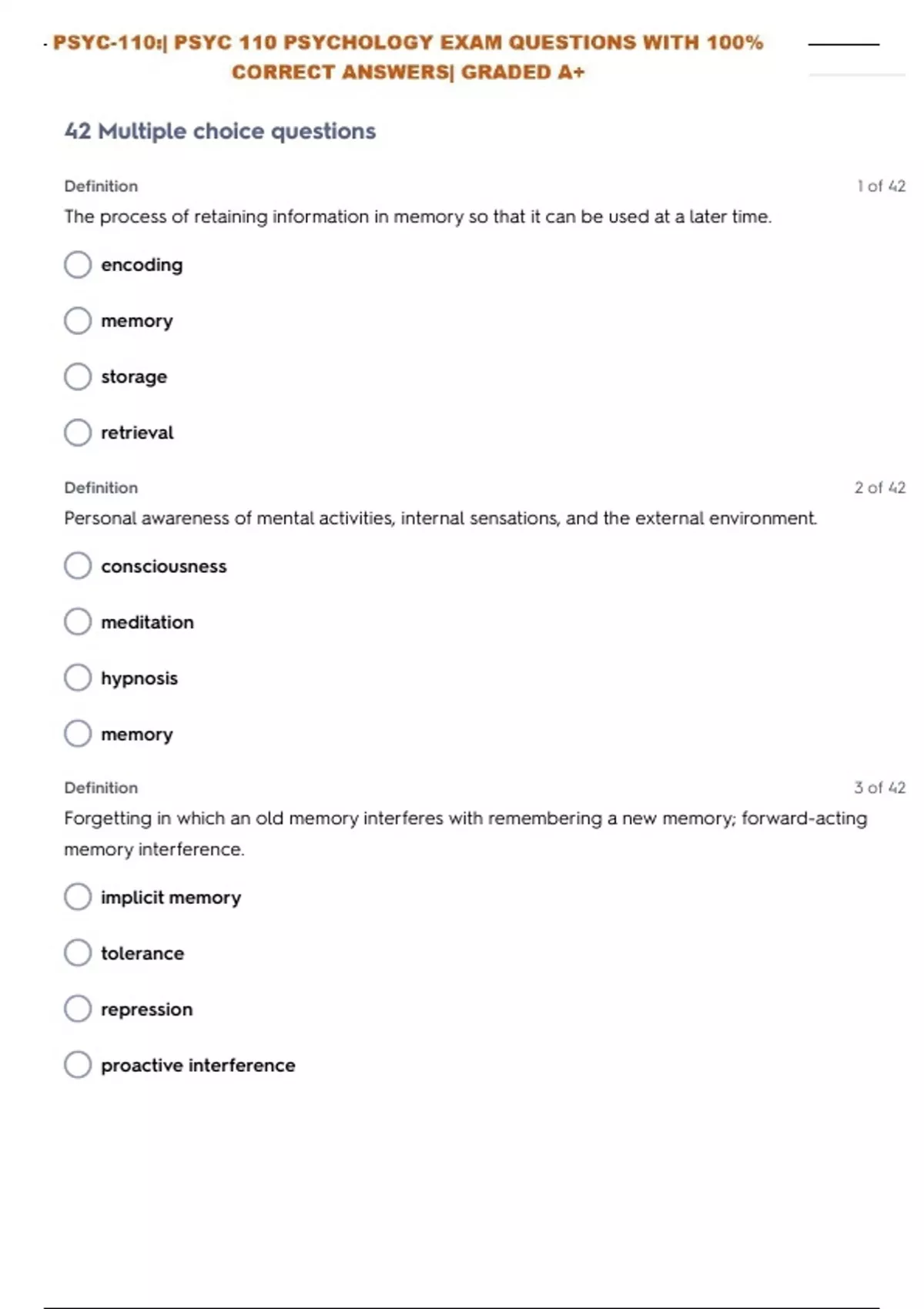 PSYC-110:| PSYC 110 PSYCHOLOGY REVISION EXAM 2 ALREADY GRADED A+ 1.The process of retaining information in memory so that it can be used at a later time