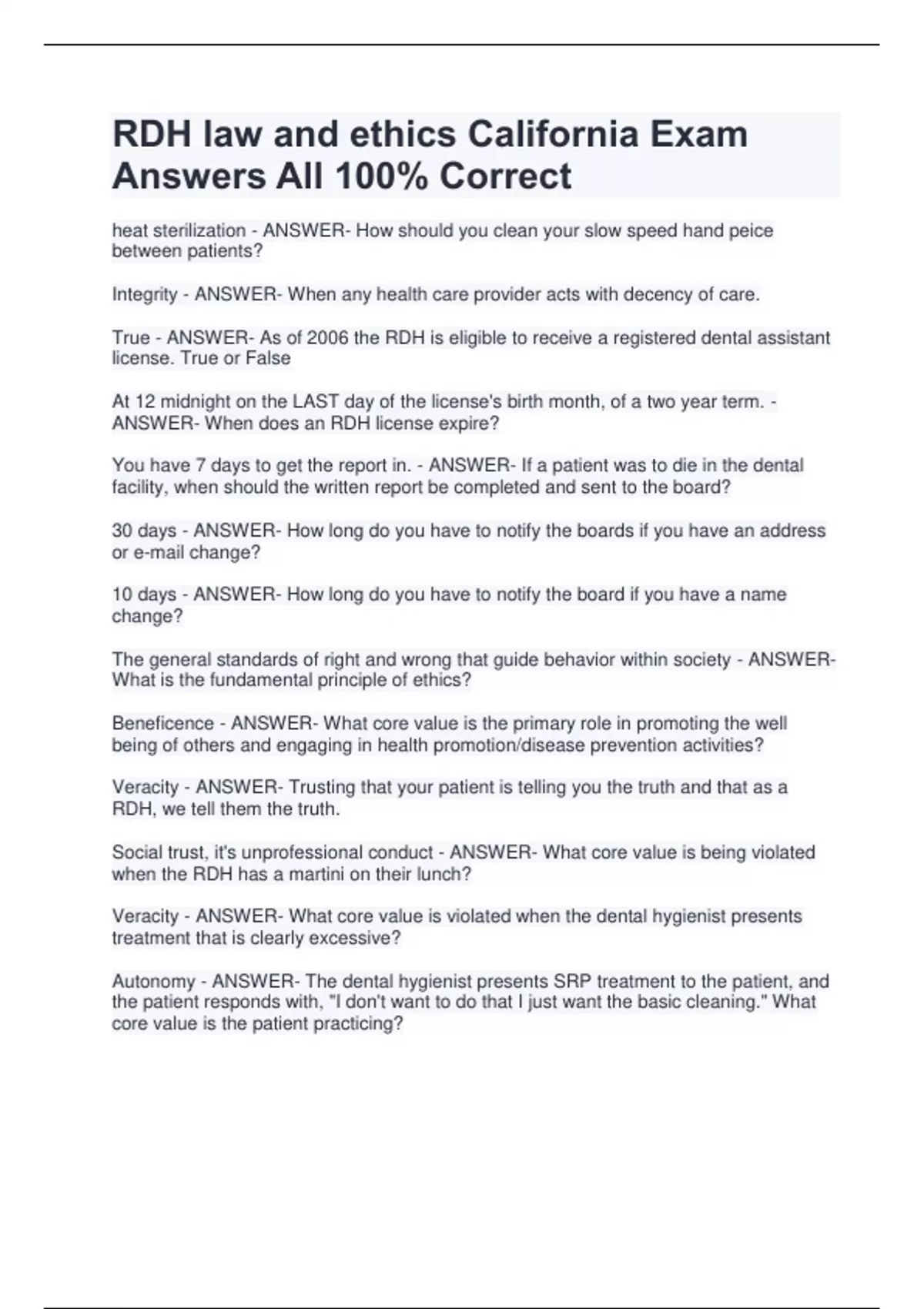 RDH law and ethics California Exam Answers All 100% Correct heat sterilization - ANSWER- How should you clean your slow speed hand peice between patients? Integrity - ANSWER- When any health care provider acts with decency of care. True - ANSWER- As of 2006 the RDH is eligible to receive a registered dental assistant license. True or False At 12 midnight on the LAST day of the license's birth month, of a two year term. - ANSWER- When does an RDH license expire? You have 7 days to get the report in. - ANSWER- If a patient was to die in the dental facility, when should the written report be completed and sent to the board? 30 days - ANSWER- How long do you have to notify the boards if you have an address or e-mail change? 10 days - ANSWER- How long do you have to notify the board if you have a name change? The general standards of right and wrong that guide behavior within society - ANSWER- What is the fundamental principle of ethics? Beneficence - ANSWER- What core value is the primary role in promoting the well being of others and engaging in health promotion/disease prevention activities? Veracity - ANSWER- Trusting that your patient is telling you the truth and that as a RDH, we tell them the truth. Social trust, it's unprofessional conduct - ANSWER- What core value is being violated when the RDH has a martini on their lunch? Veracity - ANSWER- What core value is violated when the dental hygienist presents treatment that is clearly excessive?