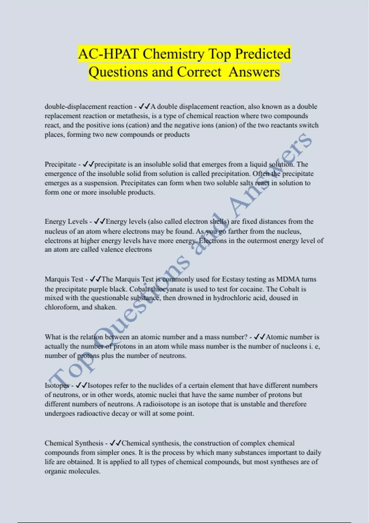 ouble-displacement reaction - A double displacement reaction, also known as a double replacement reaction or metathesis, is a type of chemical reaction where two compounds react, and the positive ions (cation) and the negative ions (anion) of the two reactants switch places, forming two new compounds or products Precipitate - precipitate is an insoluble solid that emerges from a liquid solution. The emergence of the insoluble solid from solution is called precipitation. Often the precipitate emerges as a suspension. Precipitates can form when two soluble salts react in solution to form one or more insoluble products. Energy Levels - Energy levels (also called electron shells) are fixed distances from the nucleus of an atom where electrons may be found. As you go farther from the nucleus, electrons at higher energy levels have more energy. Electrons in the outermost energy level of an atom are called valence electrons Marquis Test - The Marquis Test is commonly used for Ecstasy testing as MDMA turns the precipitate purple black. Cobalt thiocyanate is used to test for cocaine. The Cobalt is mixed with the questionable substance, then drowned in hydrochloric acid, doused in chloroform, and shaken. What is the relation between an atomic number and a mass number? - Atomic number is actually the number of protons in an atom while mass number is the number of nucleons i. e, number of protons plus the number of neutrons. Isotopes - Isotopes refer to the nuclides of a certain element that have different numbers of neutrons, or in other words, atomic nuclei that have the same number of protons but different numbers of neutrons. A radioisotope is an isotope that is unstable and therefore undergoes radioactive decay or will at some point. Chemical Synthesis - Chemical synthesis, the construction of complex chemical compounds from simpler ones. It is the process by which many substances important to daily life are obtained. It is applied to all types of chemical compounds, but most syntheses are of organic molecules. Decomposition - A decomposition reaction is a type of chemical reaction in which a single compound breaks down into two or more elements or new compounds. These reactions often involve an energy source such as heat, light, or electricity that breaks apart the bonds of compounds single-displacement reaction - A single-displacement reaction, also known as a singlereplacement reaction, is a type of chemical reaction where an element reacts with a compound and takes the place of another element in that compound. This type of reaction is typically pictured like this: Here, A replaces B in the compound BC Flame test - flame test is an analytical procedure used in chemistry to detect the presence of certain elements, primarily metal ions, based on each element's characteristic emission spectrum. The color of flames in general also depends on temperature; see flame color. Precipitation reaction - A precipitation reaction refers to the formation of an insoluble salt when two solutions containing soluble salts are combined. The insoluble salt that falls out of solution is known as the precipitate, hence the reaction's name. Precipitation reactions can help determine the presence of various ions in solution. organic compounds - An organic compound is a substance that is added to a product, like food, to improve some qualities such as taste, smell, colour and texture. These substances can be both positive and negative for human health. Synthetic materials - Synthetic materials which are by-products of petroleum are nonbiodegradable, synthetic products take a long time to decompose, creating long-term pollution. Nylon is hard to recycle, making them hard to decompose, accumulate landfills more. Polyesters are easy to recycle, which makes them less harmful to the society