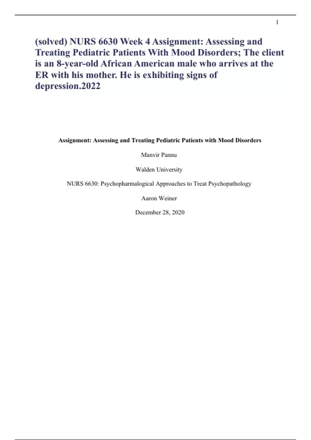 (solved) NURS 6630 Week 4 Assignment: Assessing and Treating Pediatric Patients With Mood Disorders; The client is an 8-year-old African American male who arrives at the ER with his mother. He is exhibiting signs of depression.2022