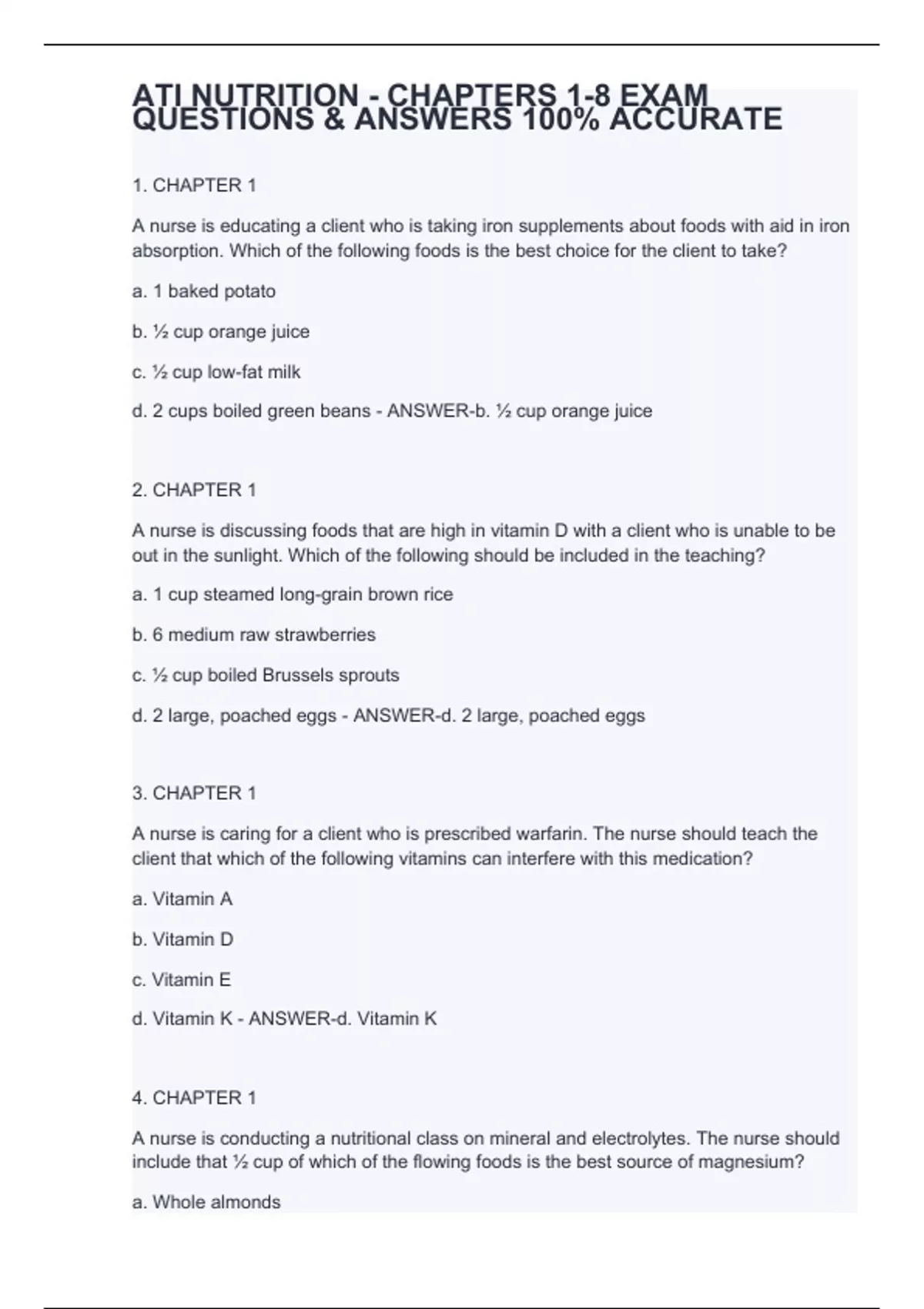 1. CHAPTER 1 A nurse is educating a client who is taking iron supplements about foods with aid in iron absorption. Which of the following foods is the best choice for the client to take? a. 1 baked potato b. ½ cup orange juice c. ½ cup low-fat milk d. 2 cups boiled green beans - ANSWER-b. ½ cup orange juice 2. CHAPTER 1 A nurse is discussing foods that are high in vitamin D with a client who is unable to be out in the sunlight. Which of the following should be included in the teaching? a. 1 cup steamed long-grain brown rice b. 6 medium raw strawberries c. ½ cup boiled Brussels sprouts d. 2 large, poached eggs - ANSWER-d. 2 large, poached eggs 3. CHAPTER 1 A nurse is caring for a client who is prescribed warfarin. The nurse should teach the client that which of the following vitamins can interfere with this medication? a. Vitamin A b. Vitamin D c. Vitamin E d. Vitamin K - ANSWER-d. Vitamin K 4. CHAPTER 1 A nurse is conducting a nutritional class on mineral and electrolytes. The nurse should include that ½ cup of which of the flowing foods is the best source of magnesium? a. Whole almonds b. Chopped tomatoes c. Raw spinach d. Low-fat vanilla yogurt - ANSWER-a. Whole almonds