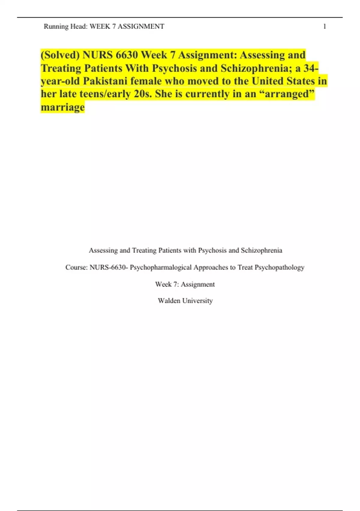 (Solved) NURS 6630 Week 7 Assignment: Assessing and Treating Patients With Psychosis and Schizophrenia; a 34-year-old Pakistani female who moved to the United States in her late teens/early 20s. She is currently in an “arranged” marriage