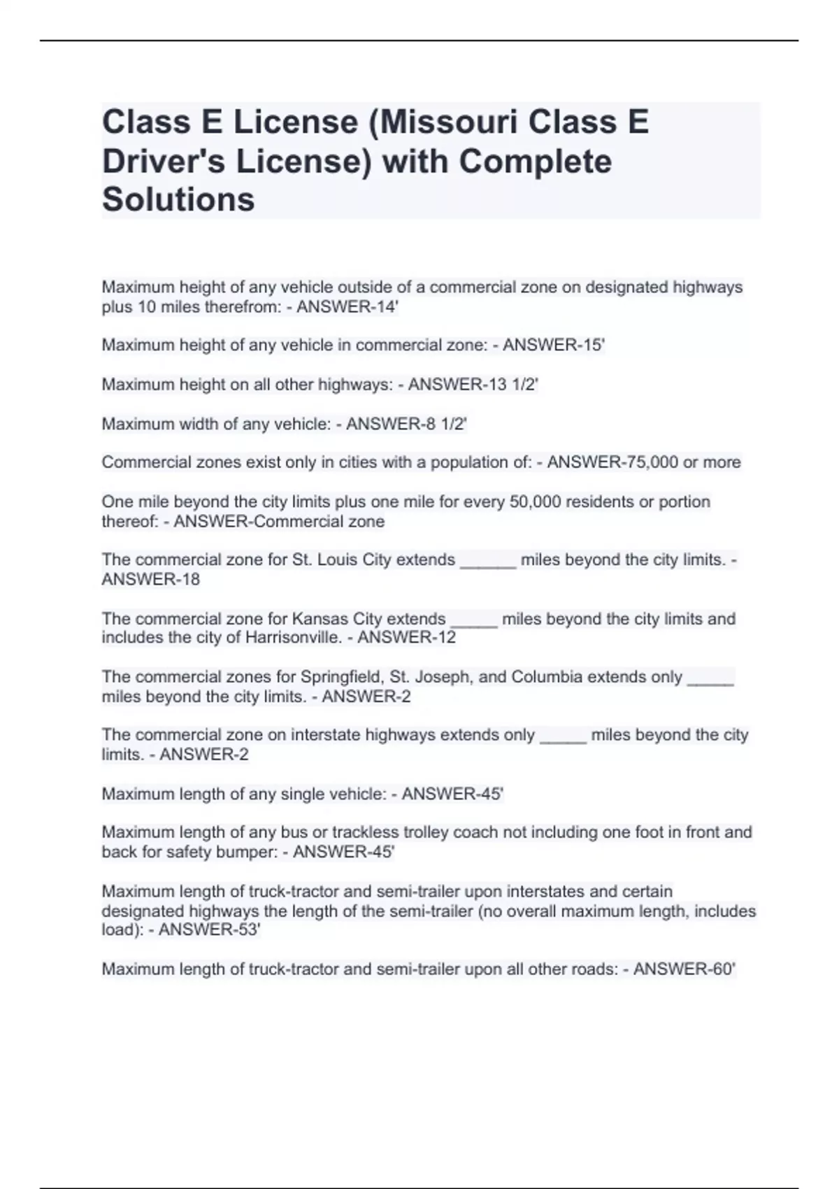 Class E License (Missouri Class E Driver's License) with Complete SolutionsClass E License (Missouri Class E Driver's License) with Complete SolutionsClass E License (Missouri Class E Driver's License) with Complete SolutionsClass E License (Missouri Class E Driver's License) with Complete Solutions Maximum height of any vehicle outside of a commercial zone on designated highways plus 10 miles therefrom: - ANSWER-14' Maximum height of any vehicle in commercial zone: - ANSWER-15' Maximum height on all other highways: - ANSWER-13 1/2' Maximum width of any vehicle: - ANSWER-8 1/2' Commercial zones exist only in cities with a population of: - ANSWER-75,000 or more