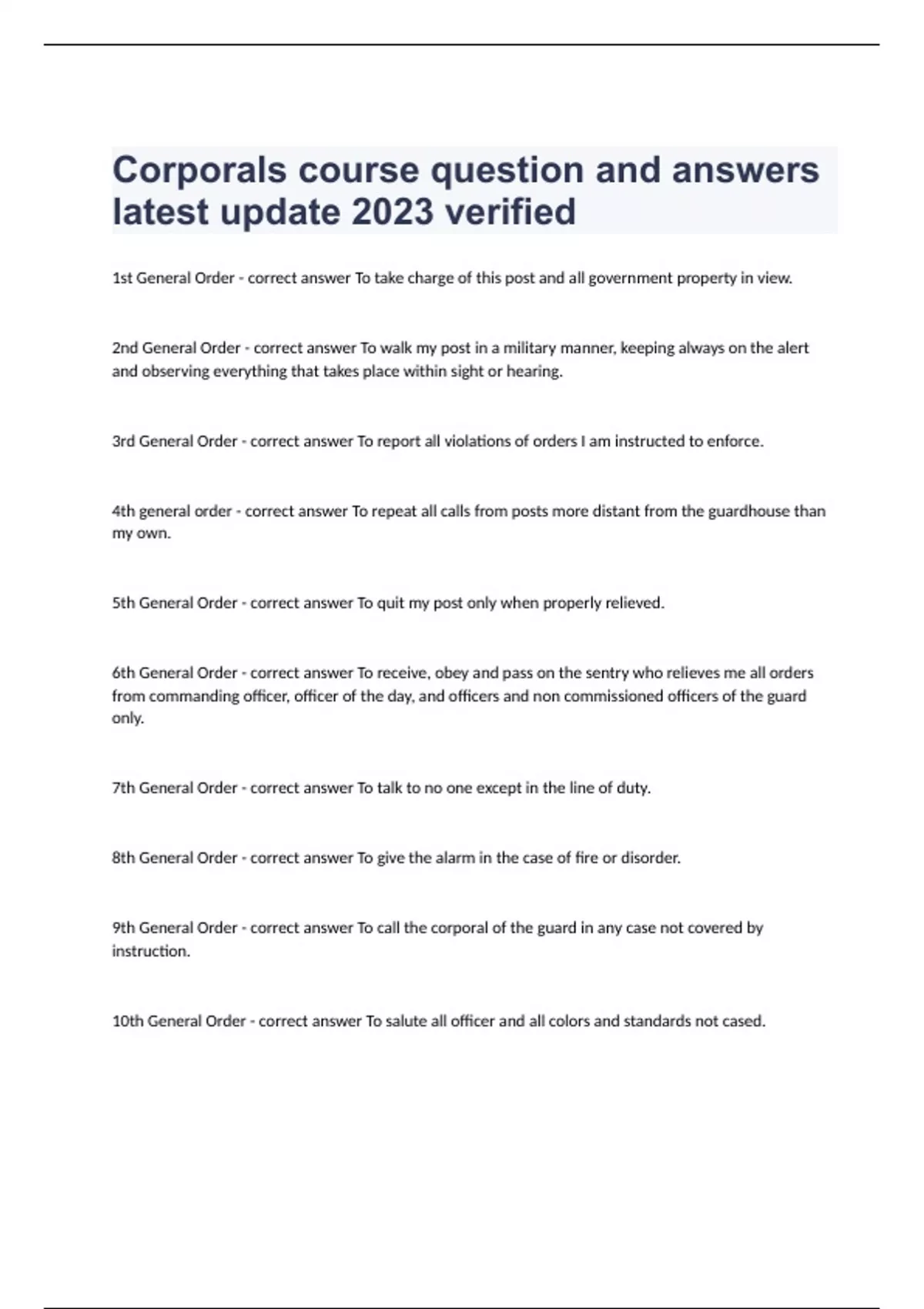 Corporals course question and answers latest solved 2024 1st General Order - correct answer To take charge of this post and all government property in view. 2nd General Order - correct answer To walk my post in a military manner, keeping always on the alert and observing everything that takes place within sight or hearing. 3rd General Order - correct answer To report all violations of orders I am instructed to enforce. 4th general order - correct answer To repeat all calls from posts more distant from the guardhouse than my own. 5th General Order - correct answer To quit my post only when properly relieved. 6th General Order - correct answer To receive, obey and pass on the sentry who relieves me all orders from commanding officer, officer of the day, and officers and non commissioned officers of the guard only. 7th General Order - correct answer To talk to no one except in the line of duty. 8th General Order - correct