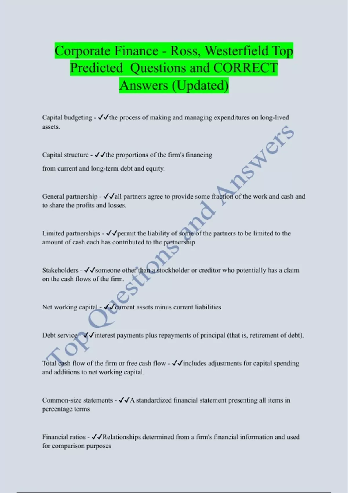 Corporate Finance - Ross, Westerfield Top Predicted Questions and CORRECT Answers (Updated)