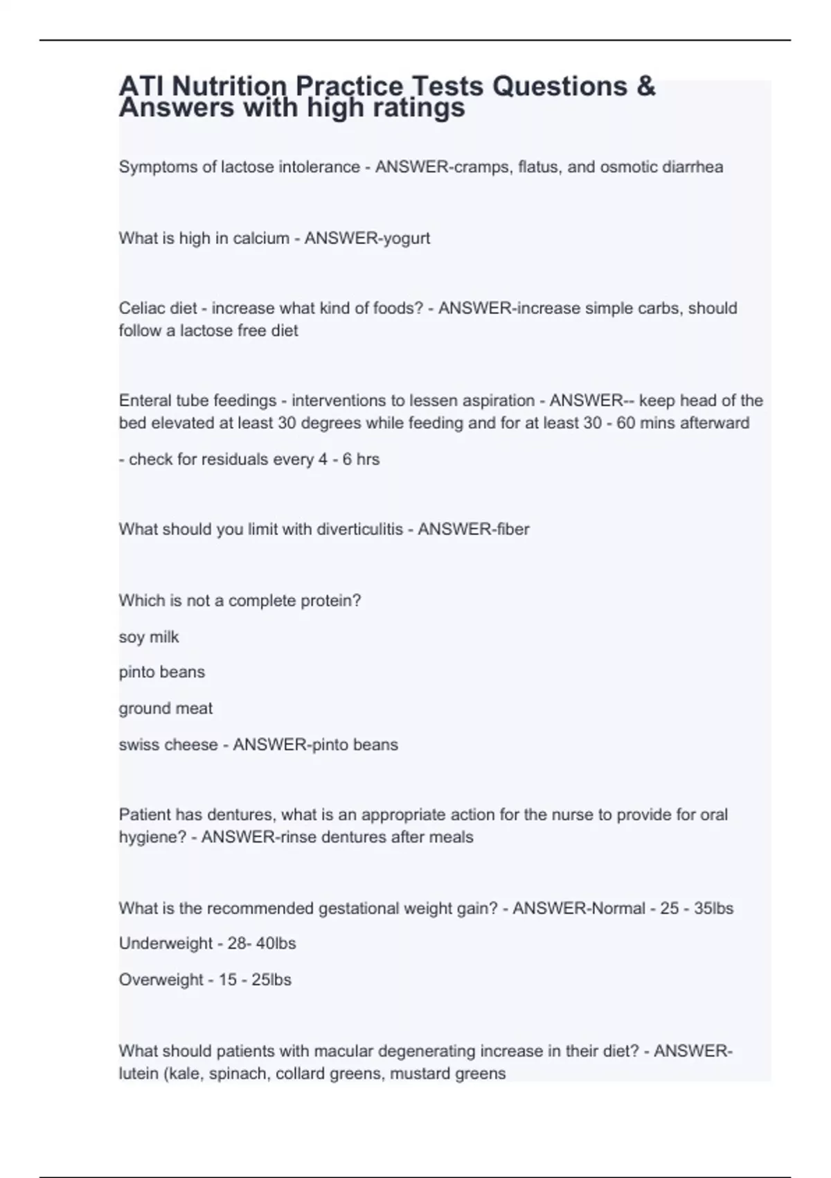 Symptoms of lactose intolerance - ANSWER-cramps, flatus, and osmotic diarrhea What is high in calcium - ANSWER-yogurt Celiac diet - increase what kind of foods? - ANSWER-increase simple carbs, should follow a lactose free diet Enteral tube feedings - interventions to lessen aspiration - ANSWER-- keep head of the bed elevated at least 30 degrees while feeding and for at least 30 - 60 mins afterward - check for residuals every 4 - 6 hrs What should you limit with diverticulitis - ANSWER-fiber Which is not a complete protein? soy milk pinto beans ground meat swiss cheese - ANSWER-pinto beans Patient has dentures, what is an appropriate action for the nurse to provide for oral hygiene? - ANSWER-rinse dentures after meals What is the recommended gestational weight gain? - ANSWER-Normal - 25 - 35lbs Underweight - 28- 40lbs Overweight - 15 - 25lbs What should patients with macular degenerating increase in their diet? - ANSWER-lutein (kale, spinach, collard greens, mustard greens