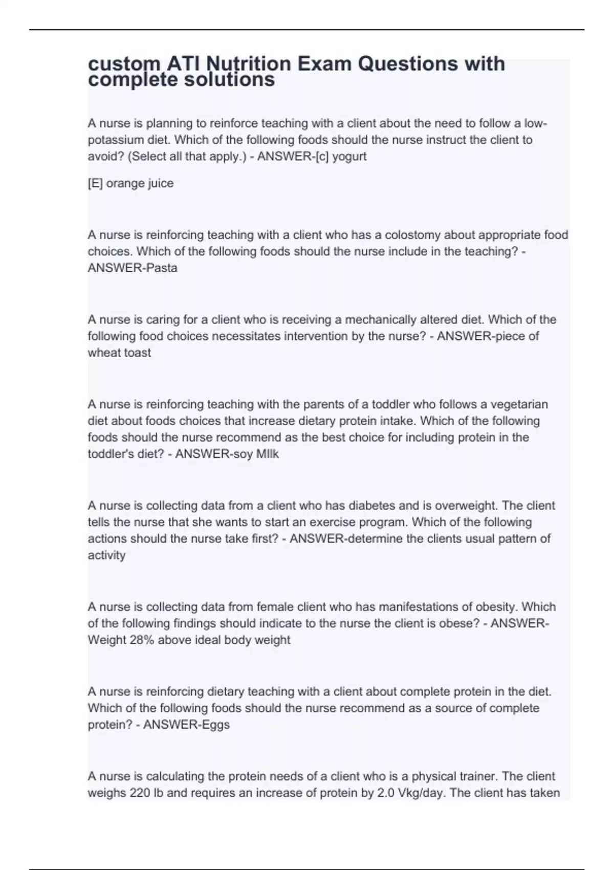 A nurse is planning to reinforce teaching with a client about the need to follow a low-potassium diet. Which of the following foods should the nurse instruct the client to avoid? (Select all that apply.) - ANSWER-[c] yogurt [E] orange juice A nurse is reinforcing teaching with a client who has a colostomy about appropriate food choices. Which of the following foods should the nurse include in the teaching? - ANSWER-Pasta A nurse is caring for a client who is receiving a mechanically altered diet. Which of the following food choices necessitates intervention by the nurse? - ANSWER-piece of wheat toast A nurse is reinforcing teaching with the parents of a toddler who follows a vegetarian diet about foods choices that increase dietary protein intake. Which of the following foods should the nurse recommend as the best choice for including protein in the toddler's diet? - ANSWER-soy MIlk A nurse is collecting data from a client who has diabetes and is overweight. The client tells the nurse that she wants to start an exercise program. Which of the following actions should the nurse take first? - ANSWER-determine the clients usual pattern of activity A nurse is collecting data from female client who has manifestations of obesity. Which of the following findings should indicate to the nurse the client is obese? - ANSWER-Weight 28% above ideal body weight A nurse is reinforcing dietary teaching with a client about complete protein in the diet. Which of the following foods should the nurse recommend as a source of complete protein? - ANSWER-Eggs