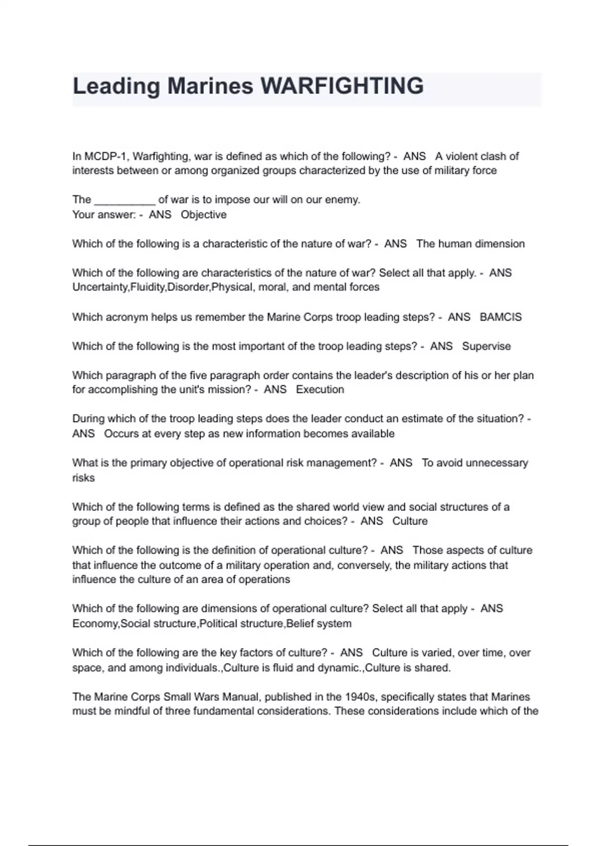 Leading Marines WARFIGHTING Exam Questions And Answers In MCDP-1, Warfighting, war is defined as which of the following? - ANS A violent clash of interests between or among organized groups characterized by the use of military force The __________ of war is to impose our will on our enemy. Your answer: - ANS Objective Which of the following is a characteristic of the nature of war? - ANS The human dimension Which of the following are characteristics of the nature of war? Select all that apply. - ANS Uncertainty,Fluidity,Disorder,Physical, moral, and mental forces Which acronym helps us remember the Marine Corps troop leading steps? - ANS BAMCIS Which of the following is the most important of the troop leading steps? - ANS Supervise Which paragraph of the five paragraph order contains the leader's description of his or her plan for accomplishing the unit's mission? - ANS Execution